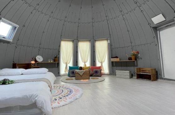 「EZDOME DOMANI 550(イージードーム ドマーニ ゴーゴーマル) 」は、直径5.5m/高さ3.5mと圧倒的な存在感の大型サイズでありながら、DIYで組み立て・分解が容易なモジュール工法となっています。