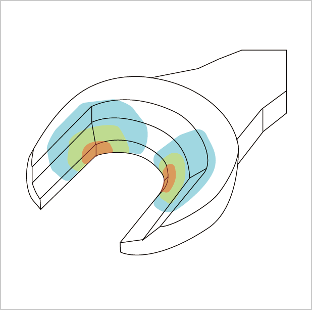 通常の薄口スパナに対して、強力極薄スパナのヘッド部は「薄口の一段目」と「通常厚の二段目」の二層構造になっており、一段目が受ける力を二段目に分散することで、通常スパナ比90%のトルクまで許容することができるので、口が開く事を恐れずに安心してお使い頂けます。