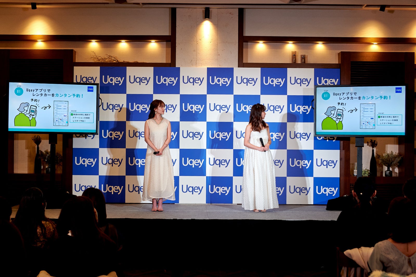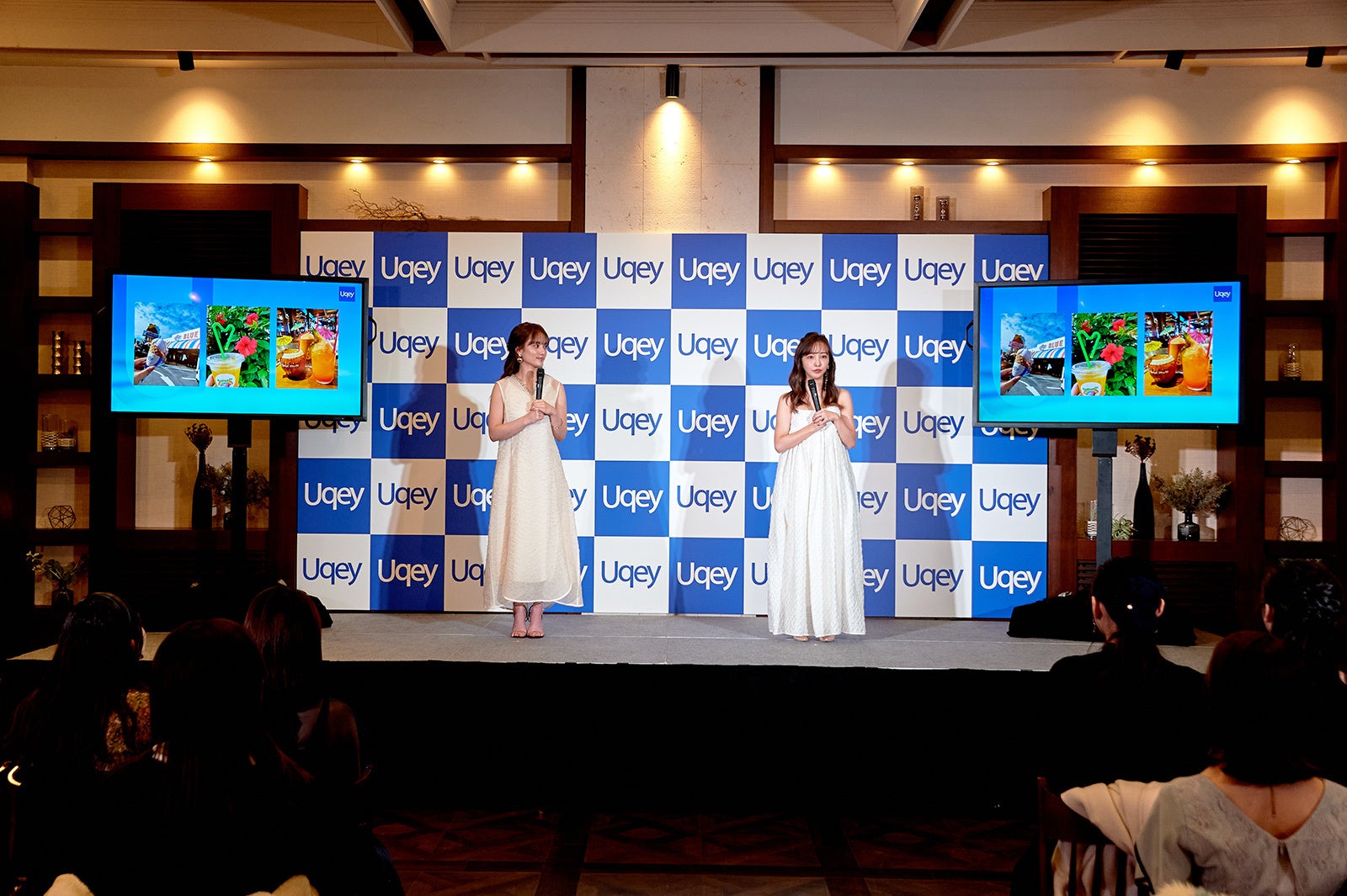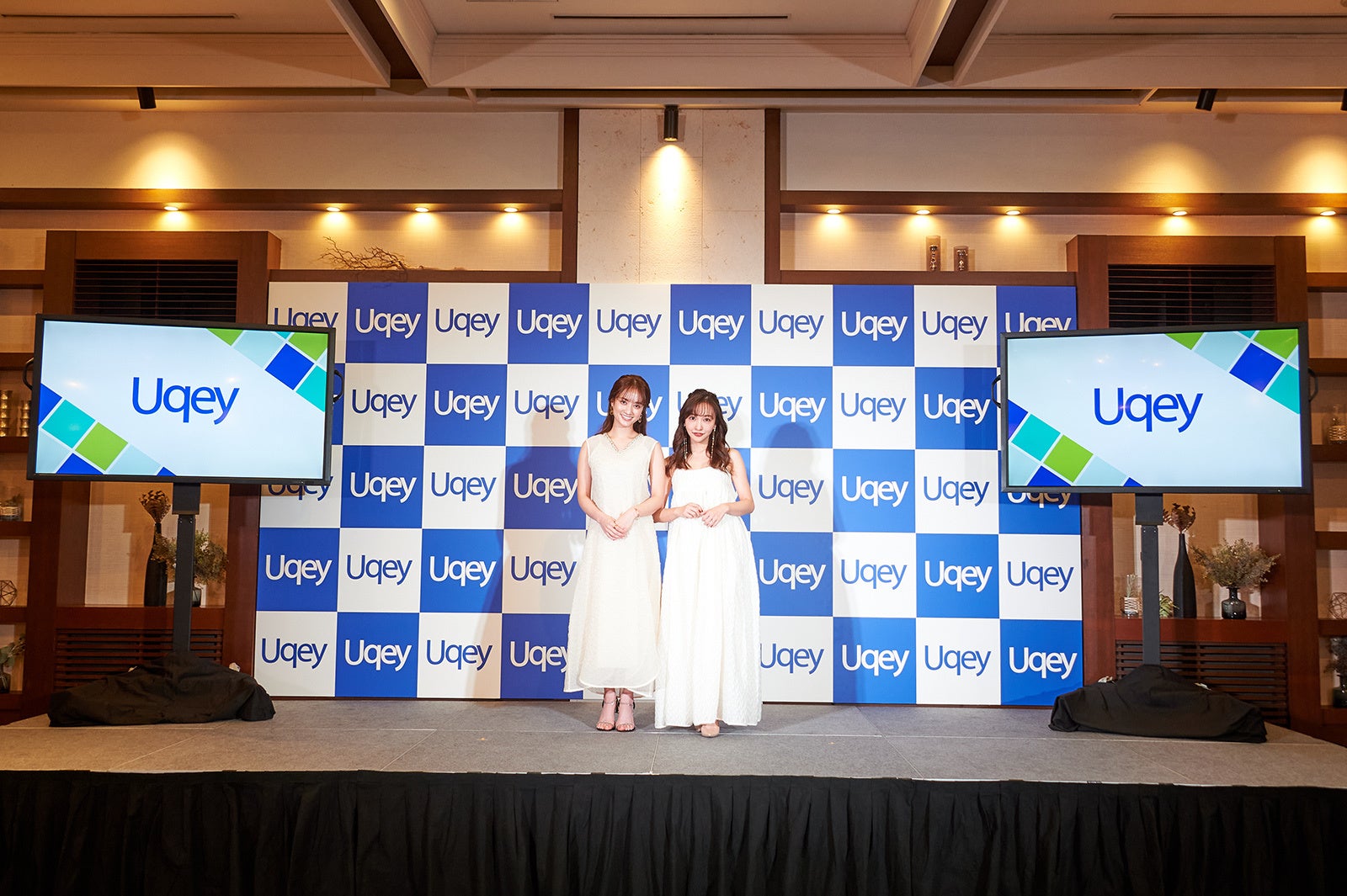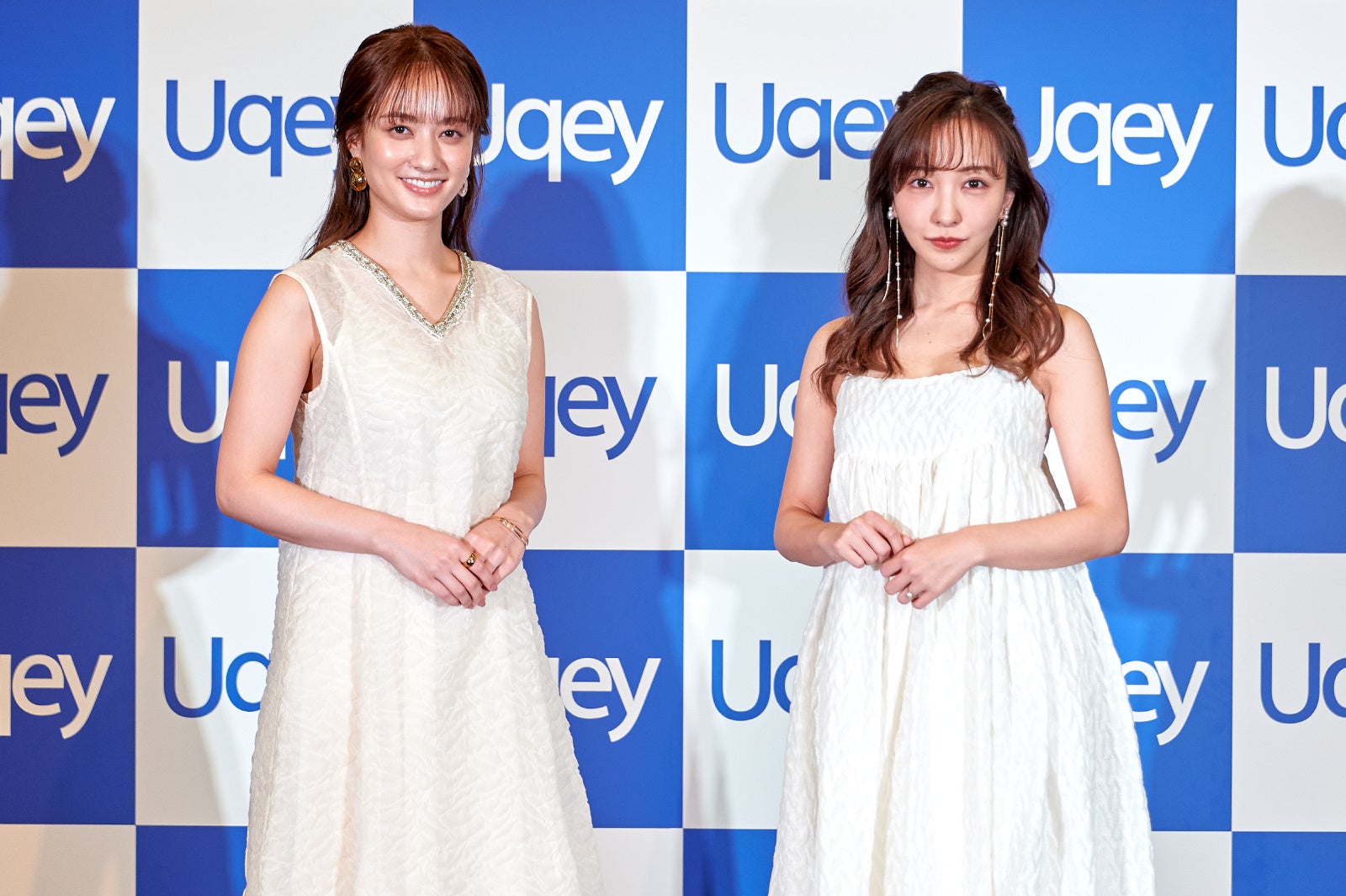 今回「Uqey」をイメージしたホワイトのワンピース姿で登場した2人。肩出しスタイルの板野さんと軽やかな透け感がおしゃれな谷さんが並ぶと、華々しいオーラに会場から大きな拍手が送られました。