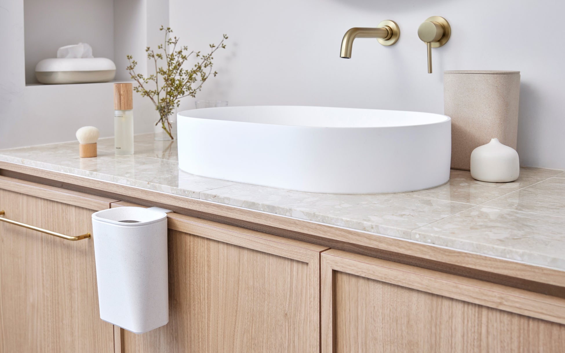 スタイルに合わせて、置き・掛けができる2wayのミニダストボックス。ゴミ袋が見えることなく、空間を美しく保ちます。角のない優しいフォルムと、浮遊感のある繊細なデザインでそっと生活に溶け込み、心地よい空間を作り出します。