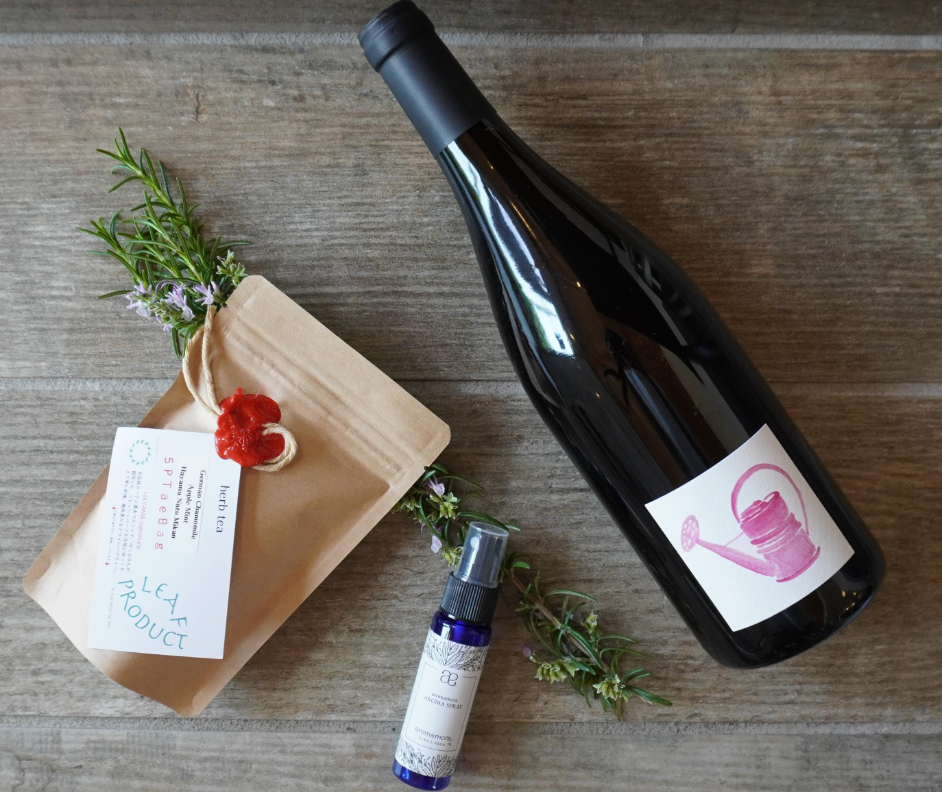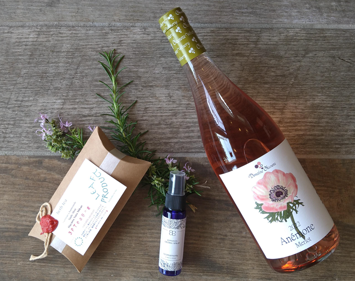 本企画のきっかけは、代表の鬼無が葉山のコーヒースタンドで飲んだハーブティです。香りと力強い味わいに感動したハーブティは、大橋マキさん主催の「はっぷ」のハーブから作られたものでした。大橋マキさん手作りの「Mother」という名のアロマオイルスプレーがあることもわかり、「母の日に、香りを楽しむワインと共に贈りたい」とお願いをし、本企画が実現いたしました。お母さんたちに、香りを楽しめる、アロマオイルスプレーとハーブティ、香り豊かなバラ色のロゼワインをセットにいたしました(ノンアルコールのセットもございます)。