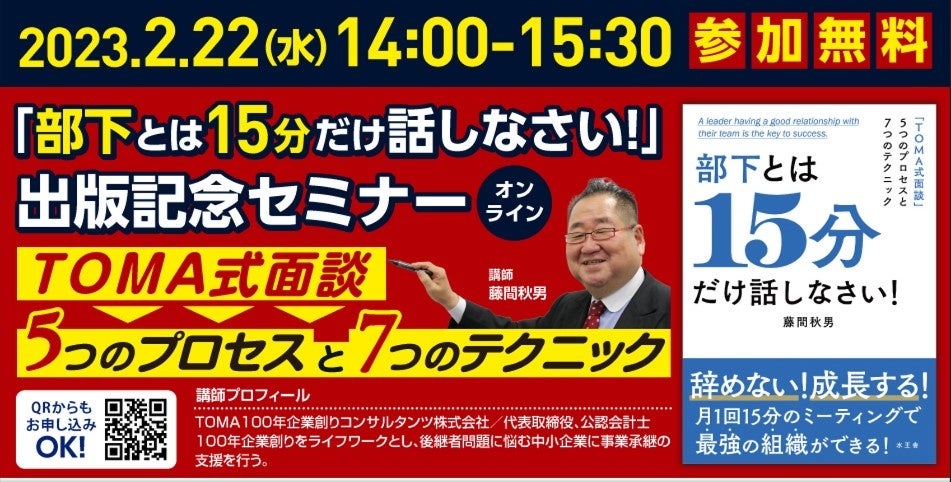TOMAコンサルタンツグループ(株)会長 藤間秋男は、「TOMA式面談」5つのプロセスと7つのテクニックを大公開する「部下とは15分だけ話しなさい!」出版記念セミナーを2月22日無料オンライン開催します!(詳細・お申込み先 : https://bit.ly/3PSf5SM )