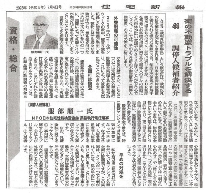 不動産・建築の専門誌「住宅新報」にて認定マンションタイル管理アドバイザーのコラムが掲載されました。
