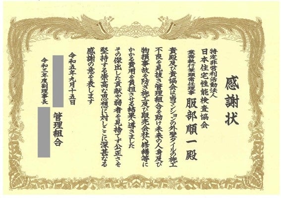マンション外壁トラブルを解決した際、管理組合様から感謝状をいただきました。
