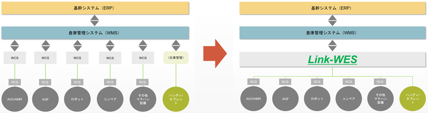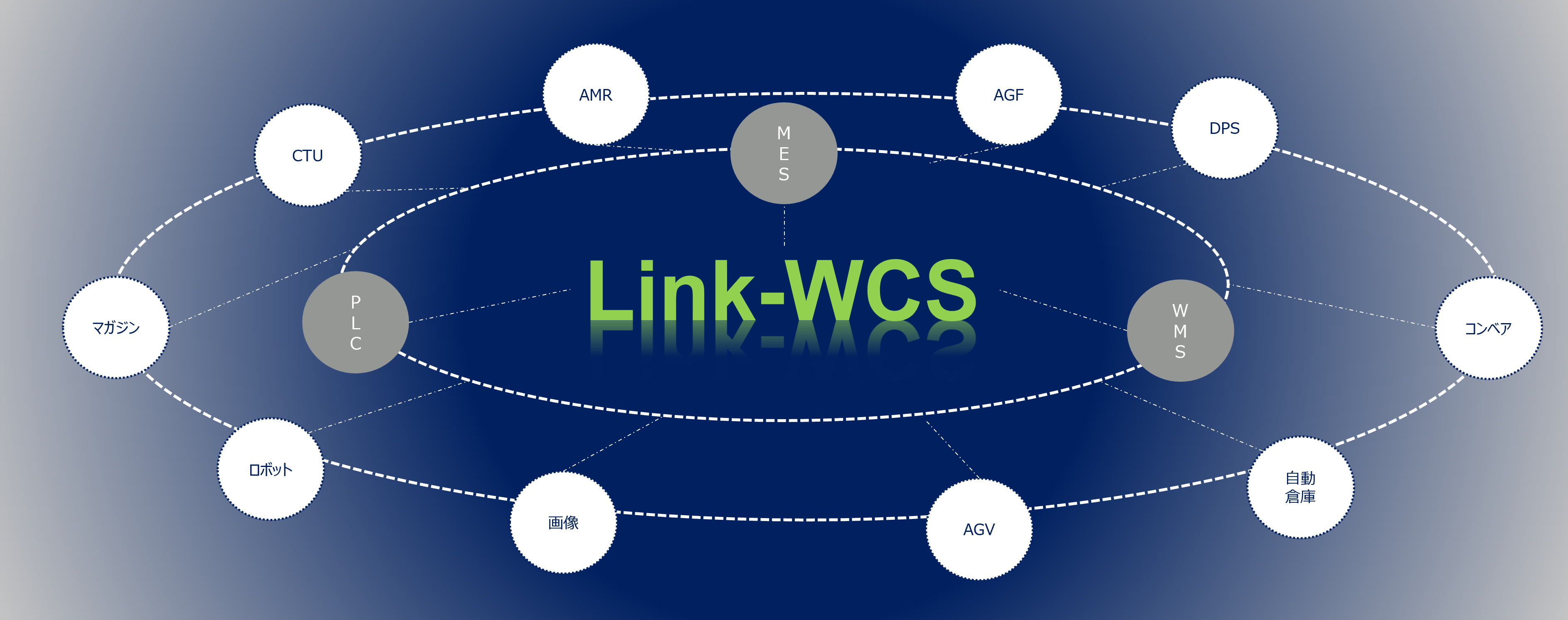 WCS(Warehouse Control System/ 倉庫制御システム)とは、倉庫内の設備を制御することに特化した ITシステムのことをいいます。LinK₋WCS は、上位システム( MES/WMS )と自動化設備のインターフェースの役割を果たし、上位システムの情報をもとに、複数のロボットや設備を総合的に遠隔制御して、効率の良い運用を可能にした、「統合WCS」です。