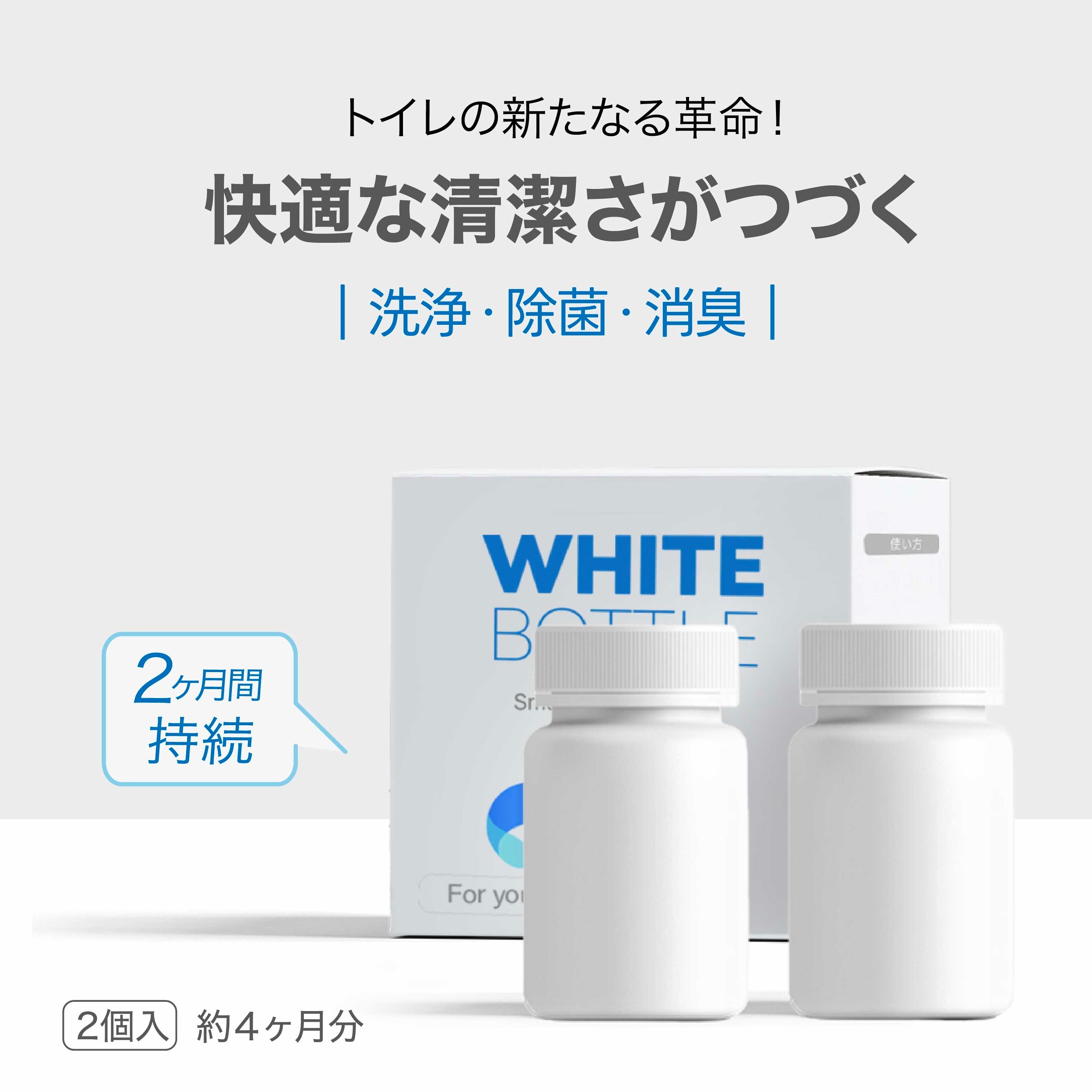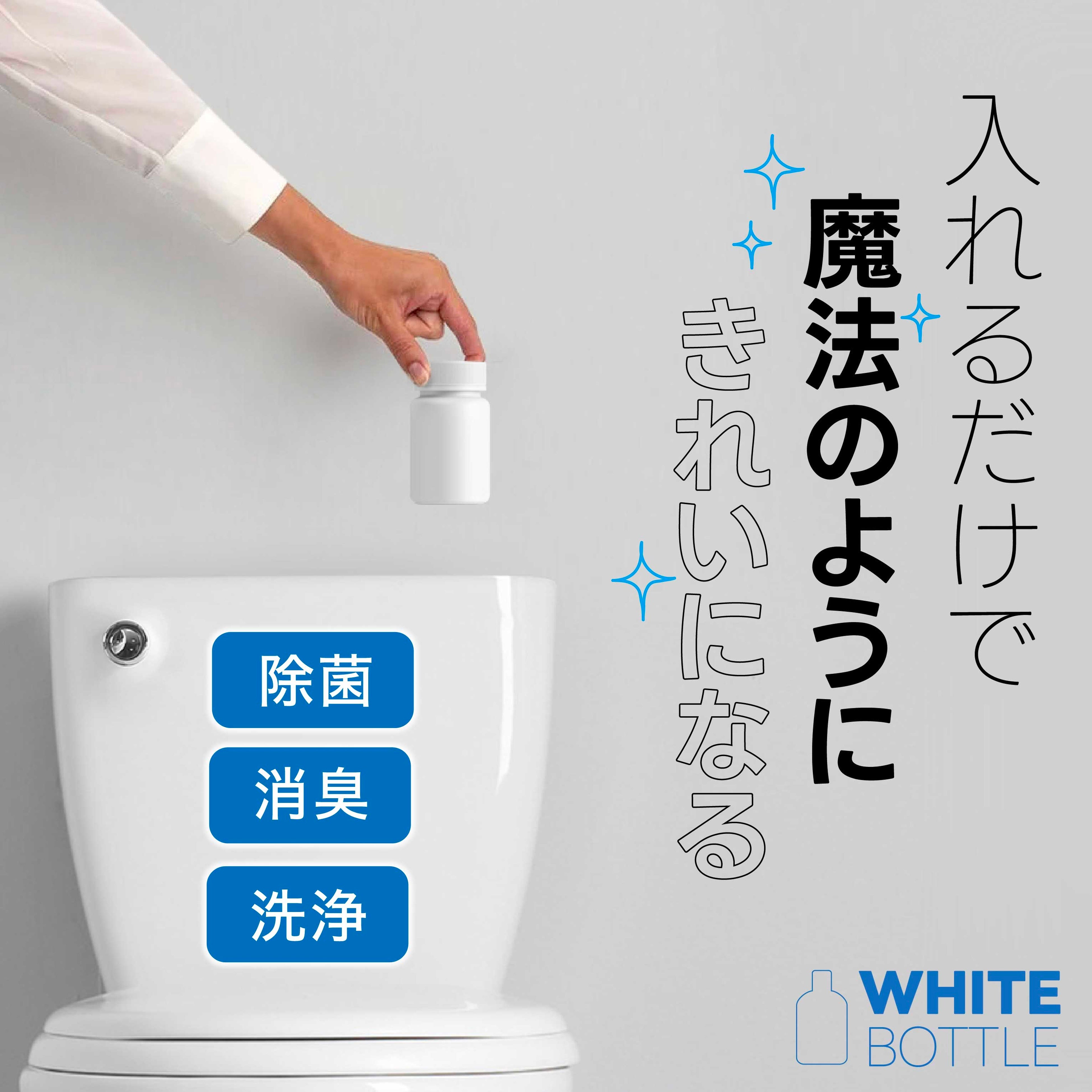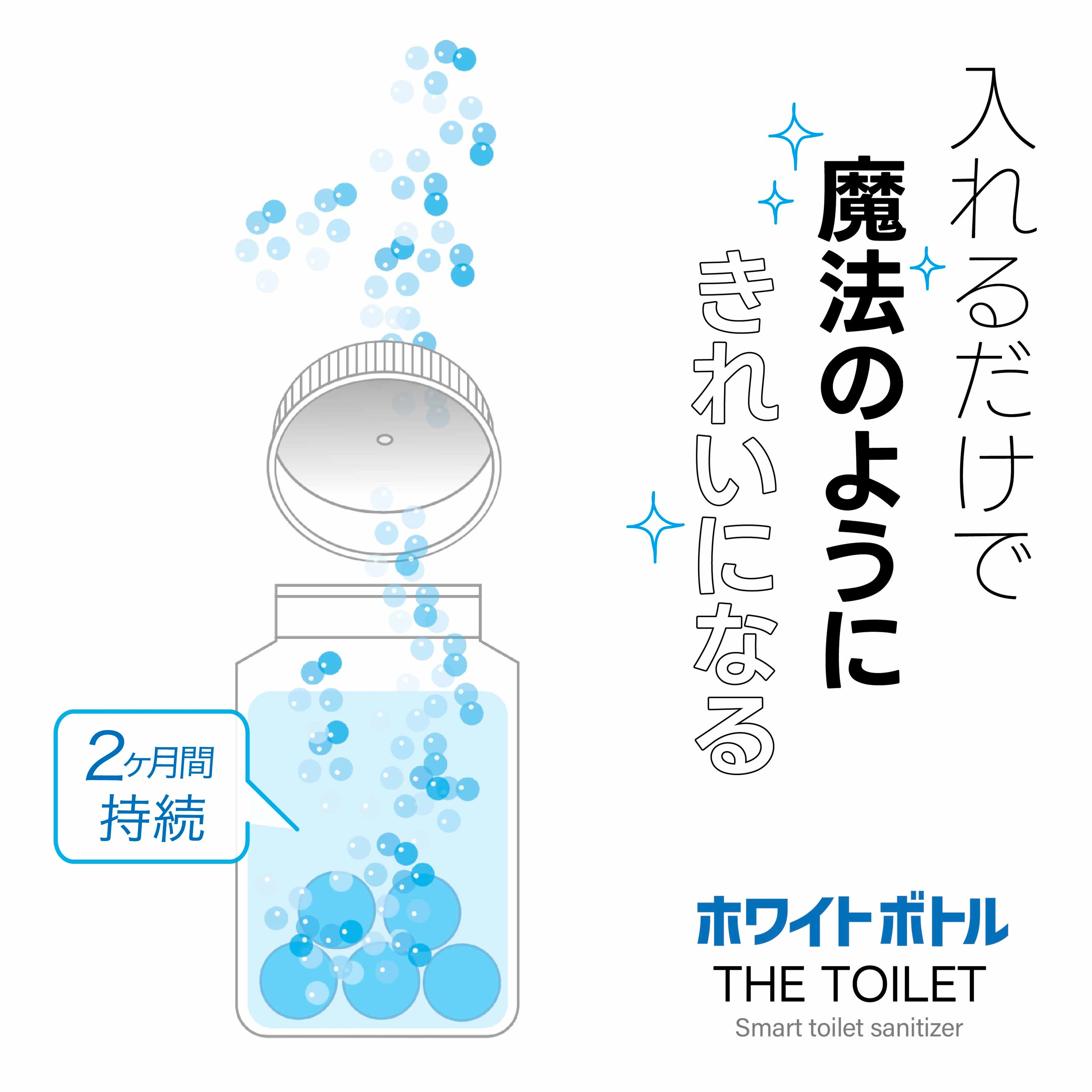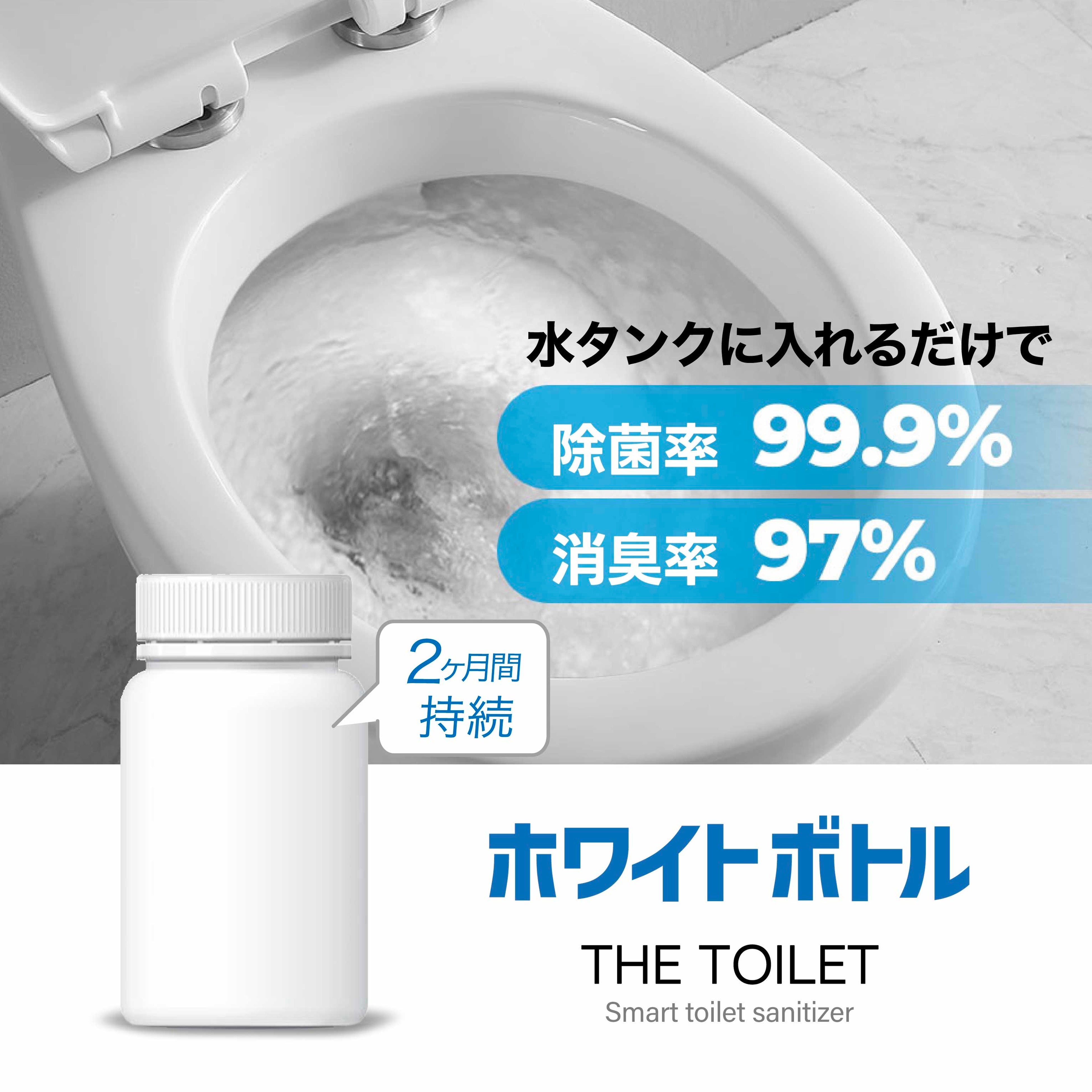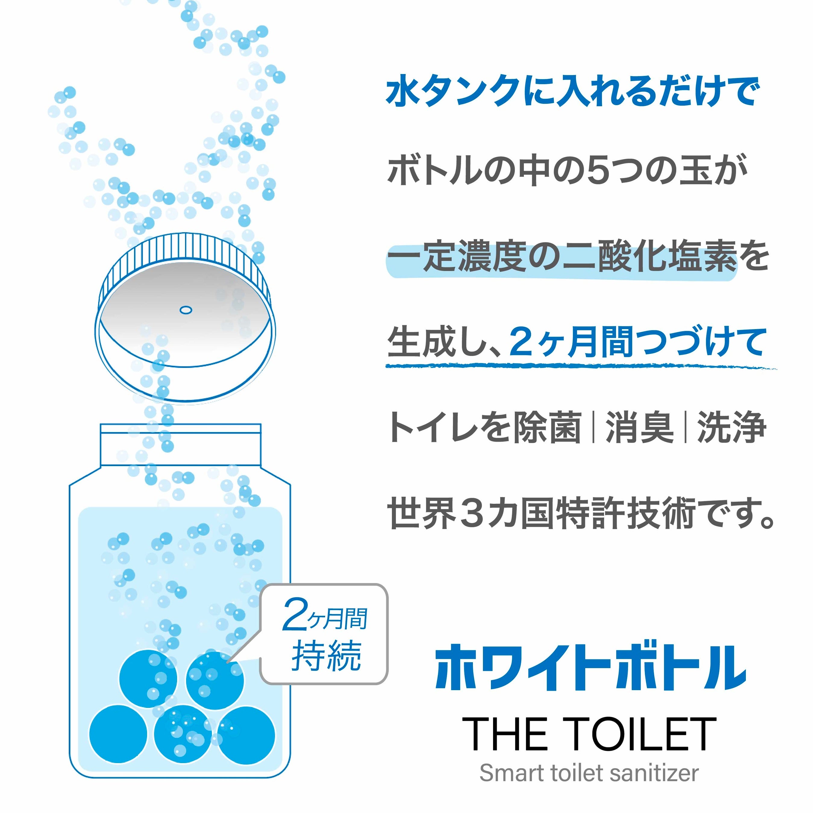 ホワイトボトルはトイレの臭いやウイルスをきれいに除去し、その効果が2ヶ月間も持続する革新的な商品です。特許技術(※韓国、日本・アメリカ出願中)の5つの玉が入った100mlのボトルに水を加えることで、二酸化塩素が生成され、トイレのウイルスやカビ、臭い、汚れを効果的に除去します。トイレの水タンクに本製品を入れるだけという簡単な使い方で便器の内部からトイレ室内の空気まで清潔で快適な空間を保持します。