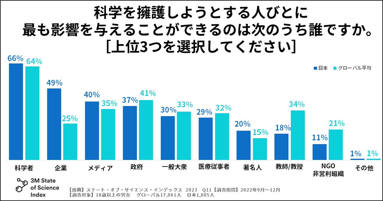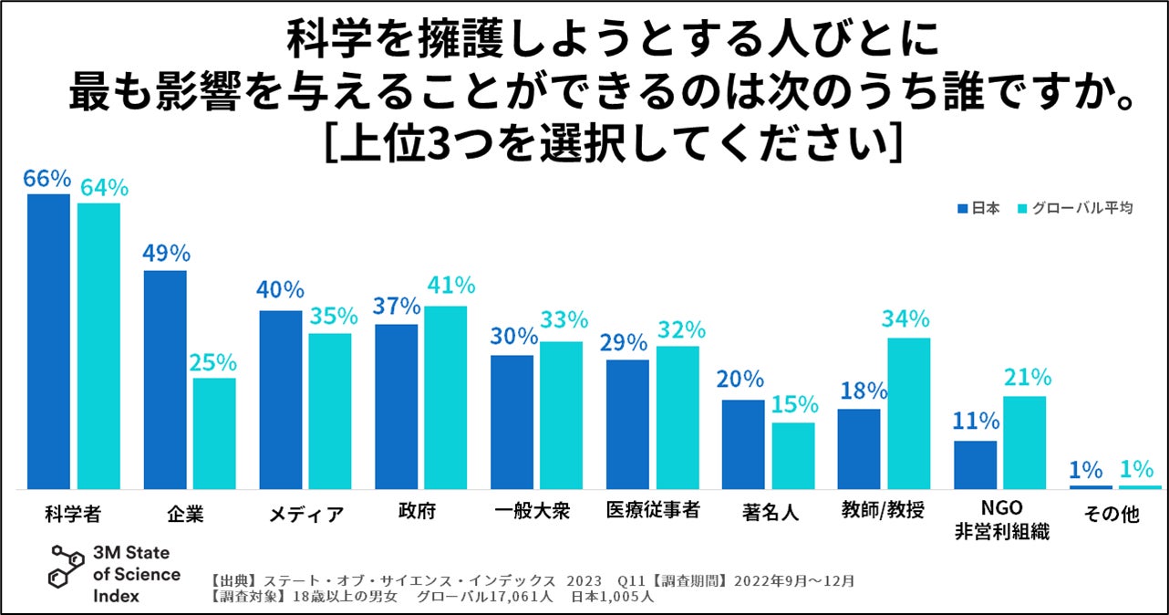 さらに、同調査において「科学を擁護しようとする人々に影響を与える人」として、日本の回答の上位3つは、「科学者」「企業」「メディア」の順となり、「企業」を選んだ人の割合はグローバル平均の約2倍となっています。