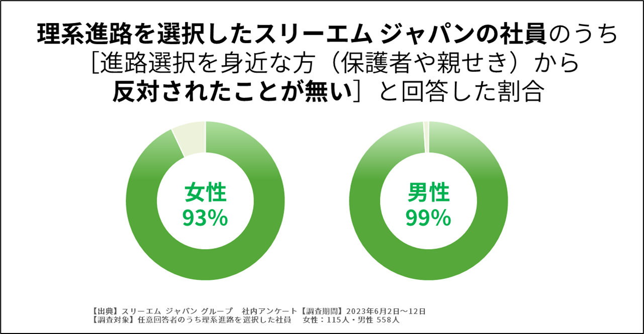 他方、スリーエム ジャパンの社内アンケートの結果では、理系進路を選択した社員でそれを身近な方(保護者や親せき)から反対されたことが無いと回答した割合は男性が99%、女性が93%でした。