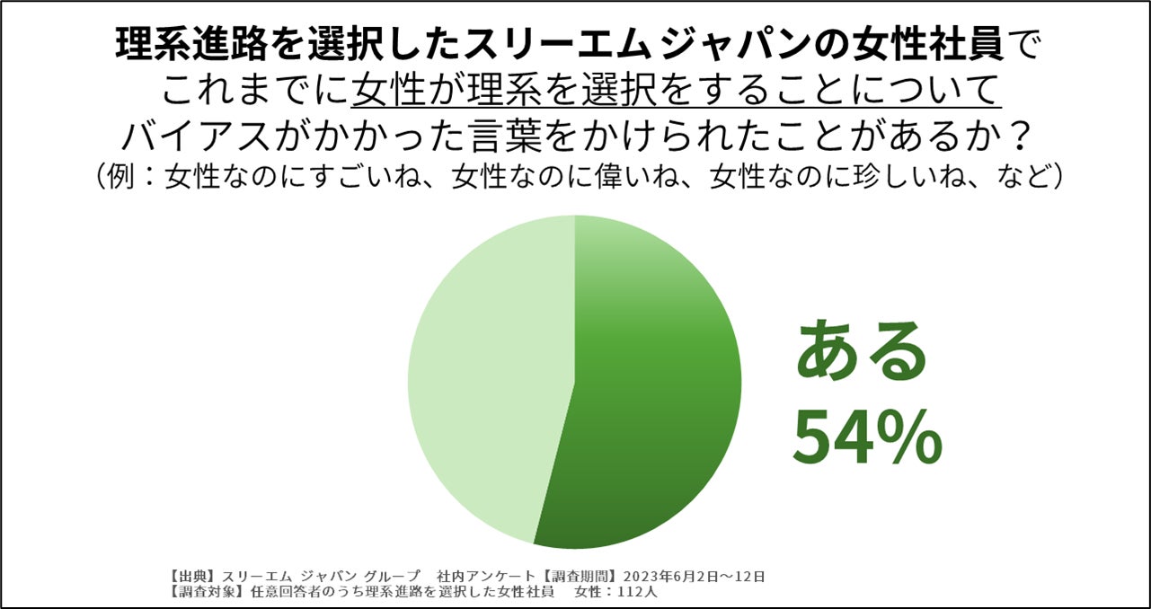 また、同アンケートでは、理系進路を選択した女性社員の54%が「女性なのにすごいね」などのアンコンシャスバイアスのかかった言葉をかけられた経験があることが分かり、登壇者からは「女性で物理学を専攻しているなんて珍しいね、すごいね、という声をかけられたことがある」や「女子なのになぜ博士課程まで進学したのかと親戚や周囲から言われたことがある」などの体験談が語られました。