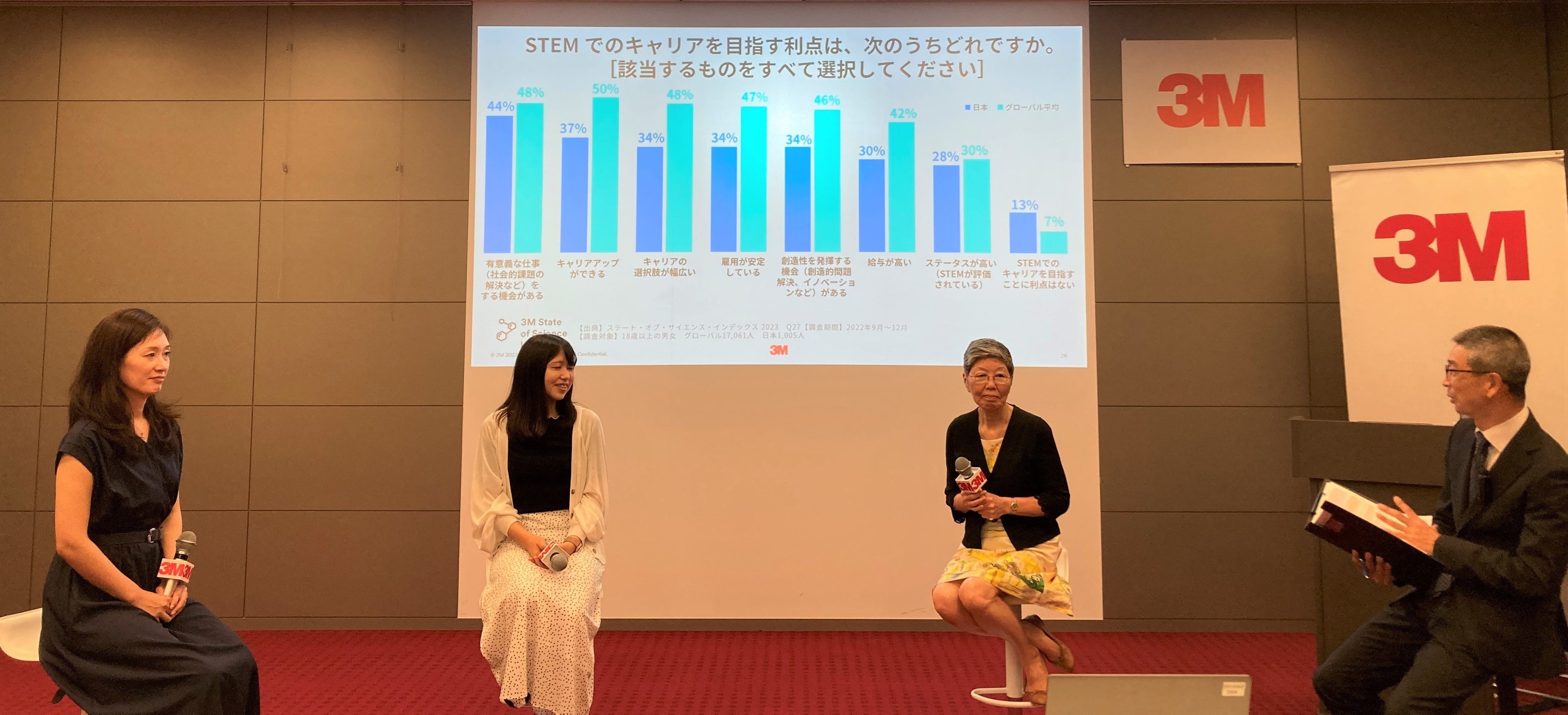 パネリストとして、特定非営利活動法人 日本科学振興協会 代表理事 東北大学 名誉教授の原山優子氏、東北大学大学院 工学研究科の女子学生1名を迎え、スリーエム ジャパンの社員2名とともに「STEM分野に女性比率向上がなぜ求められるのか」「女性の理系進出を促すには」をテーマに、主に3Mが独自で行った2つの調査結果を用いて議論を行いました。