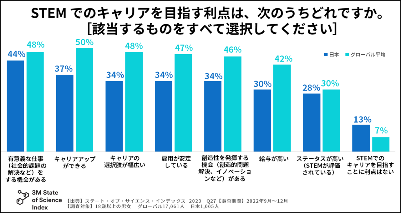 SOSIの調査における「STEMキャリアを目指す利点」を選ぶ設問では、全ての項目で日本の回答がグローバルの平均を下回っていることが分かりました。特に「STEMでのキャリアを目指す利点はない」と回答した割合がグローバル平均の約2倍となっています。