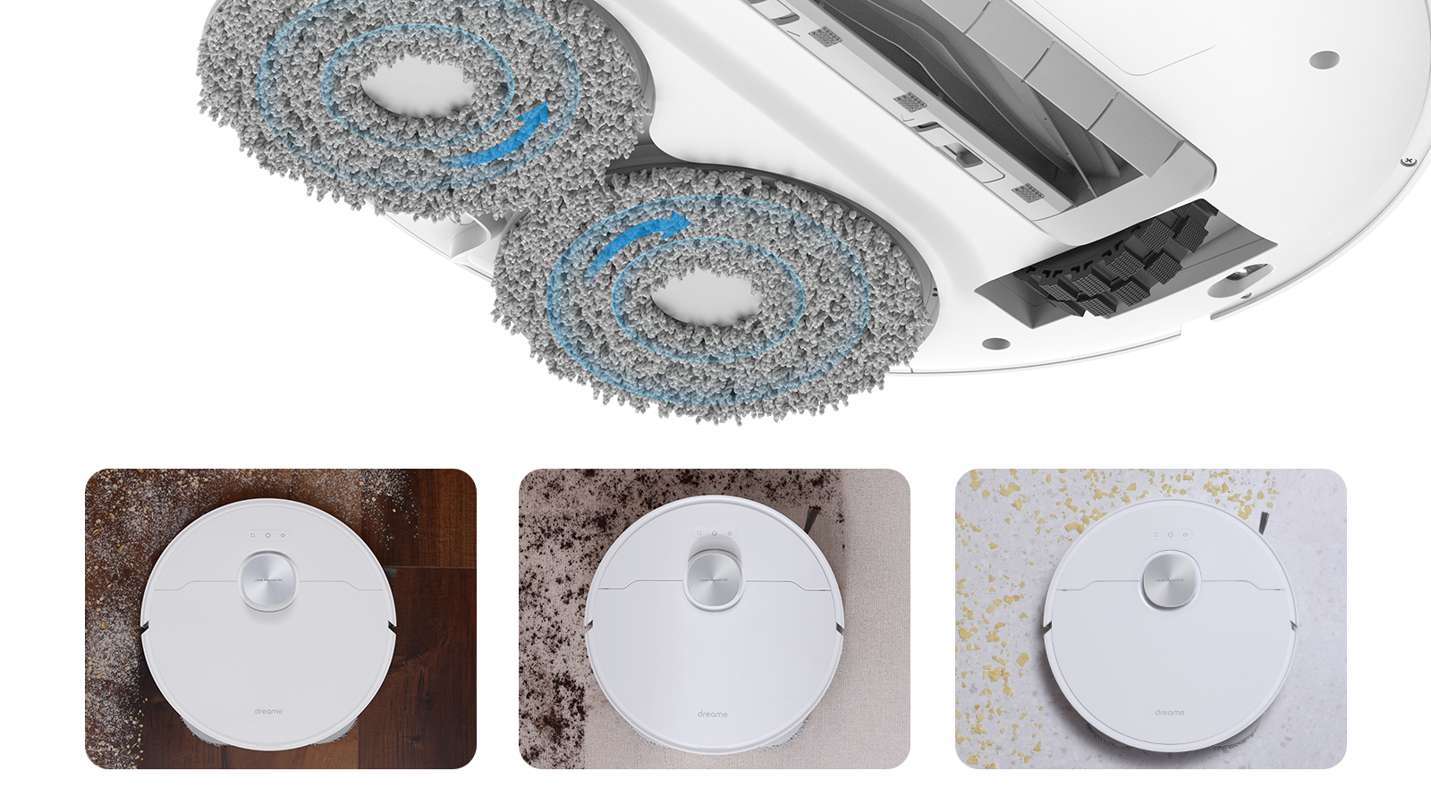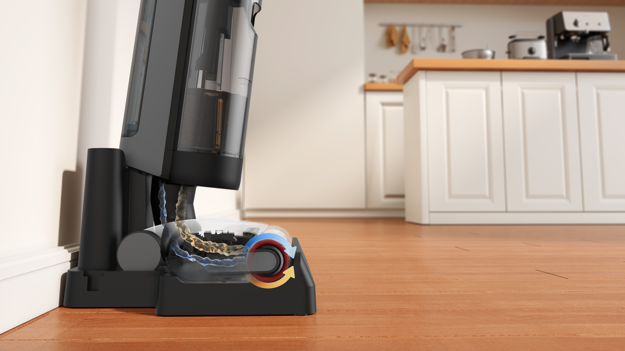Dreameの独自開発の「双方向回転式モップ自動洗浄システム」、セルフクリーニングプロセスでは、ローリングブラシが洗濯機の前後交互回転とスクラブを模倣し、革新的な二重コーム構造設計と組み合わせることで、ローリングブラシに巻きついた髪の毛をより徹底的に洗浄できます。