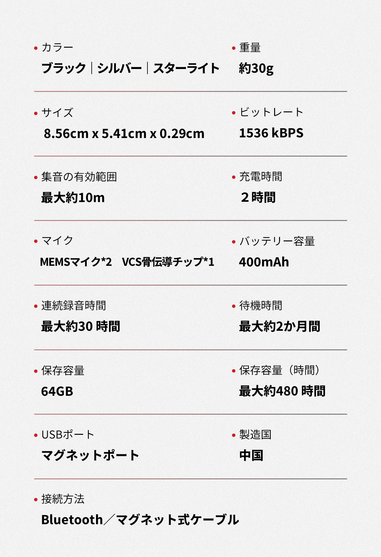 連続録音時間:最大約30時間 | 待機時間:最大約2か月間 |