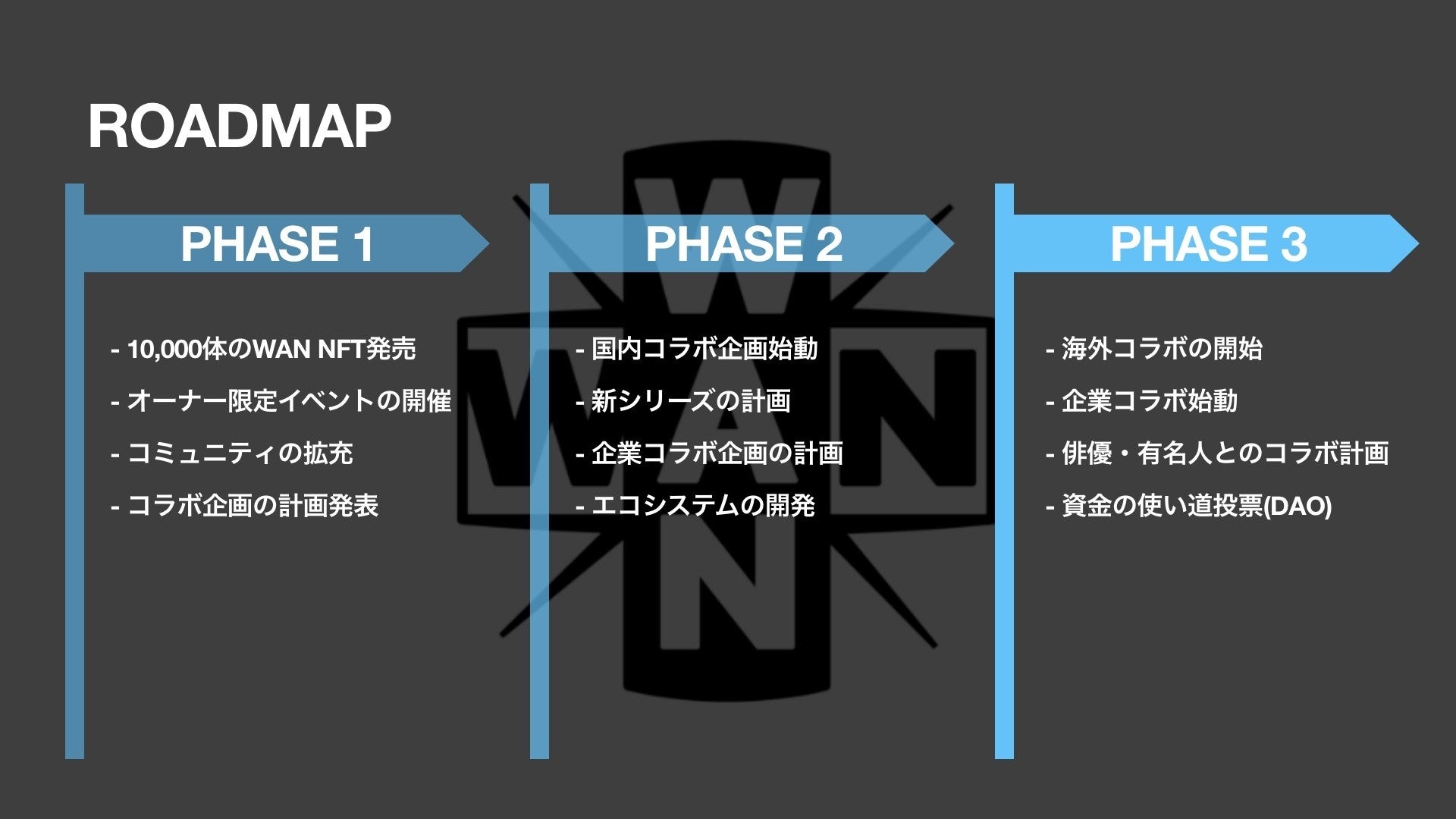 WANは、Bリーグ島根スサノオマジックの選手である「谷口大智」とアーティスト「左右田薫」による世界の動物たちをモチーフにしたNFTプロジェクト。3/4(土)〜3/11(土)までフリーミント企画を実施しており、4月下旬からは10,000体のジェネラティブアートNFTを発売予定。発売予定価格0.001ETH (約200円)。 スポンサー兼トータルプロデュースを合同会社SHiM(本社:東京都港区浜松町)が担っている。