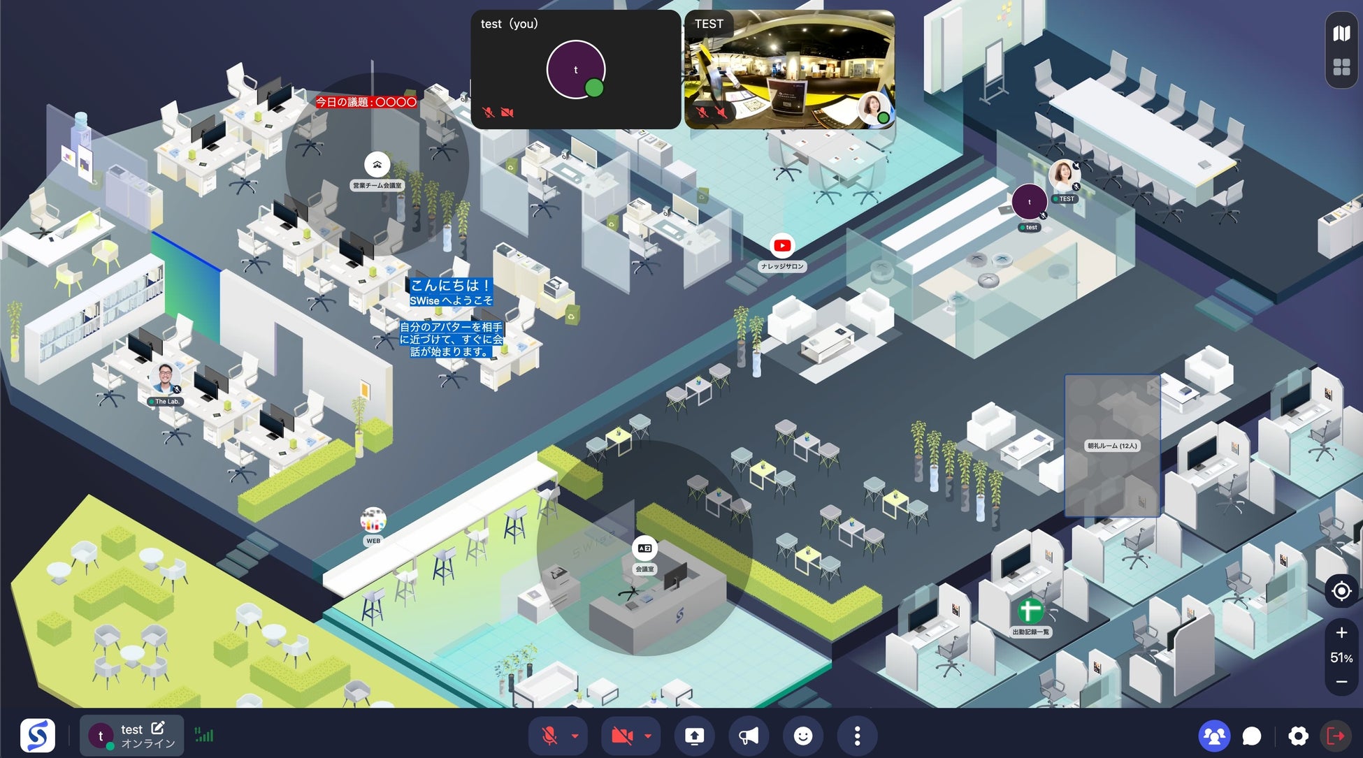 SWiseのバーチャルオフィスは、リモートワークでも「顔を合わせて話す」感覚を再現することに重点を置いています。2D空間内で自由に動くアイコンを通じて、チームメンバー間のコミュニケーションを促進し、生産性を飛躍的に向上させます。また、AI翻訳字幕機能を搭載しており、言語の壁を越えたスムーズな国際コミュニケーションを実現します。