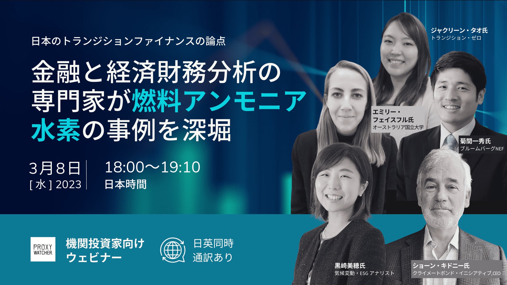 ウェビナーでは、日本で特に注目される水素・アンモニア関連技術について理解を深めるとともに、トランジションファイナンスの役割について、第一線で活躍する登壇者から見識を得ます。