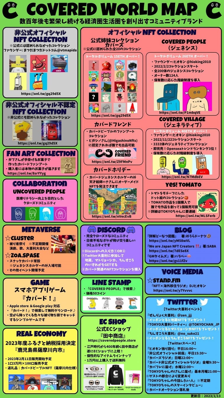 カバードピープルの本家NFTコレクションは、販売価格が1枚0.5ETH~(10万円前後・2023年1月現在)で、イラストの価値はお墨付きです。さらにそこから派生した2次創作コレクションも20ブランド以上ある日本NFT界でも人気のコレクションです。
