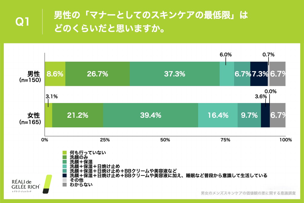 今回は、20代後半〜30代の男性150名・女性165名の合計315名に、男女のメンズスキンケアの価値観の差に関する意識調査を実施しました。