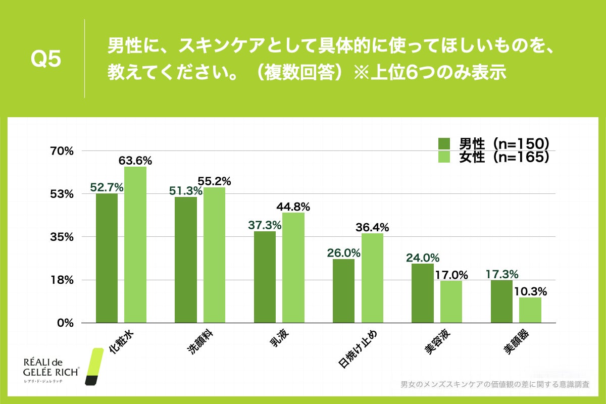 - ■メンズスキンケアとして使ってほしいもの、男女共に「化粧水」が最多