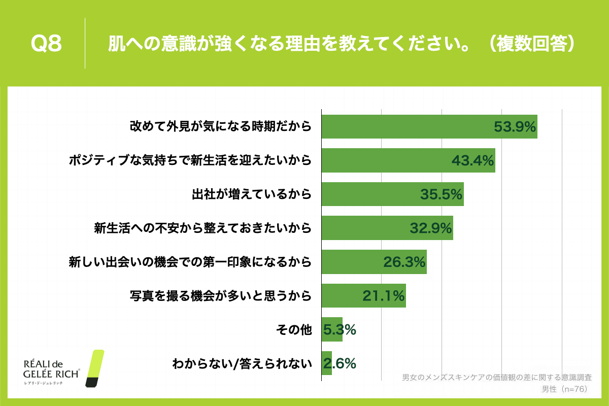 Q8. 「肌への意識が強くなる理由を教えてください。(複数回答)」と質問したところ、該当する男性の53.9%が「改めて外見が気になる時期だから」と回答。また、「マスクをとる機会だから」などの声も。(n=76)