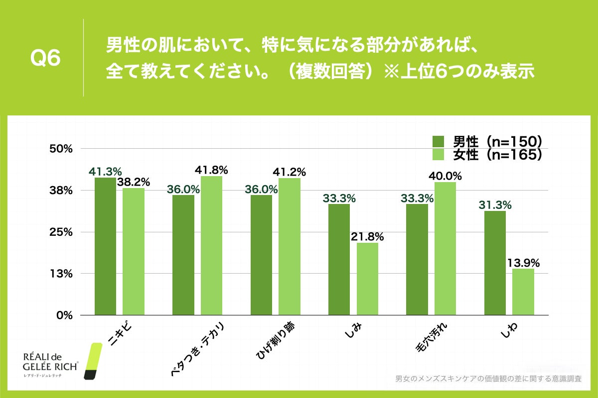 マナーとしての最低限のメンズスキンケアを伺うと、男女ともに「洗顔+保湿」が最多となっています。また、女性が男性の肌で特に気になる部分を伺うと、「ベタつき・テカリ」「ひげ剃り跡」「毛穴汚れ」などが挙げられ、男性自身が気になる部分と差があることが分かりました。