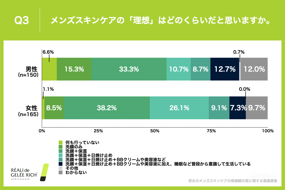 - ■理想のメンズスキンケアは男女ともに「洗顔+保湿」が最も多いが、「洗顔」や「日焼け止め」に対する意識に男女差が出る結果に
