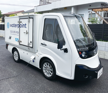 平時から「ウォーターポイント八王子」ではミネラルウォーターの配送に、二酸化炭素を排出しない電気自動車を用いています。この電気自動車のバッテリーが災害時には、蓄電池の役割を果たします。