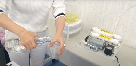 この「逆浸透膜」を通れば、下の実験写真のように緑茶も完全に水に戻ります。
