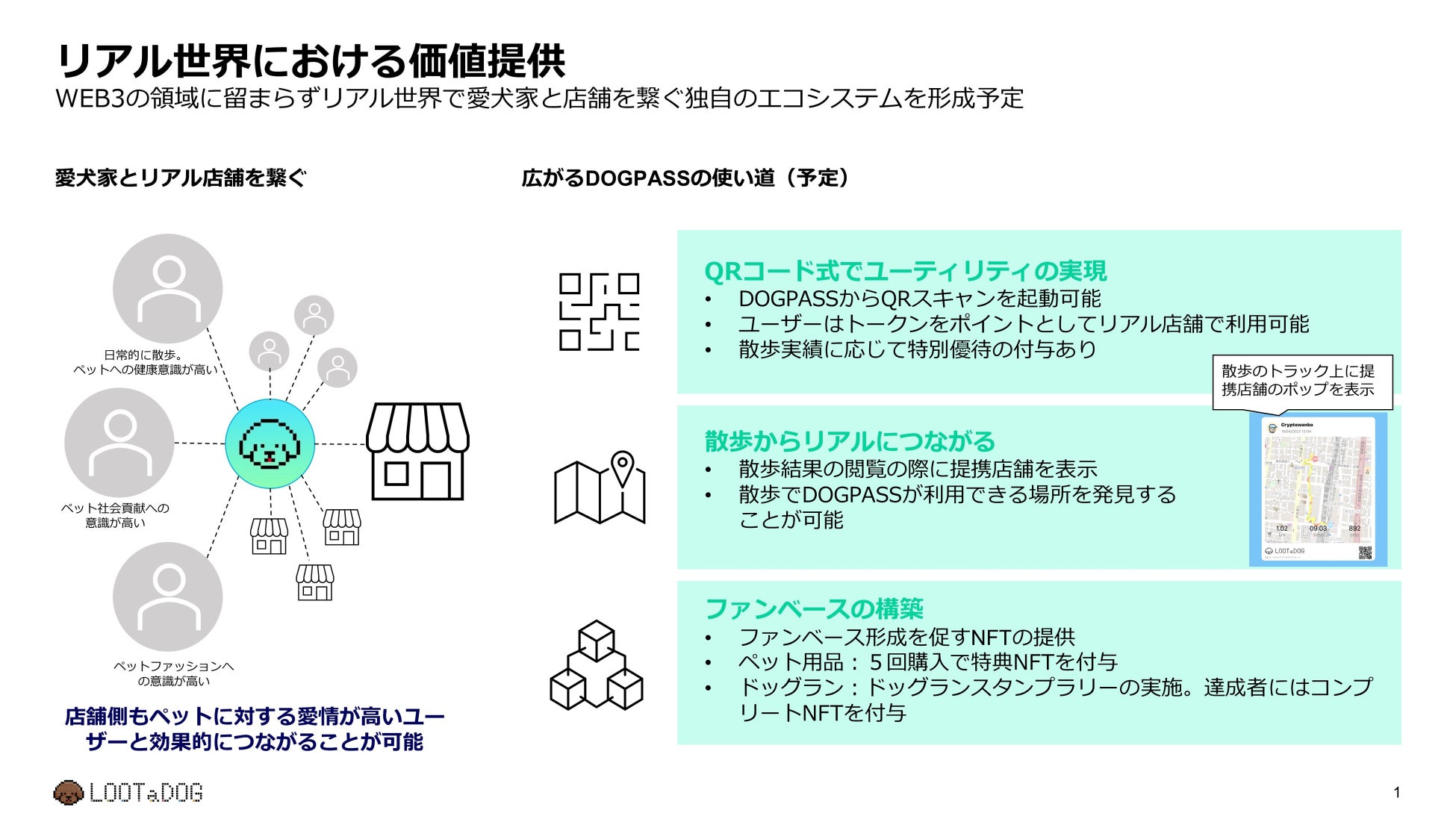 LOOTaDOGはワンちゃんとの日々の散歩をWalk-To-Ownという形でより楽しいアクティビティにするだけではなく、ゲーム内で飼い主様同士のコミュニケーションの場を提供する他、リアル店舗でのペットフードやペット用品の購入を行うサービスも今後導入予定があるなど、ワンちゃんとの生活をより豊かに出来るものです。