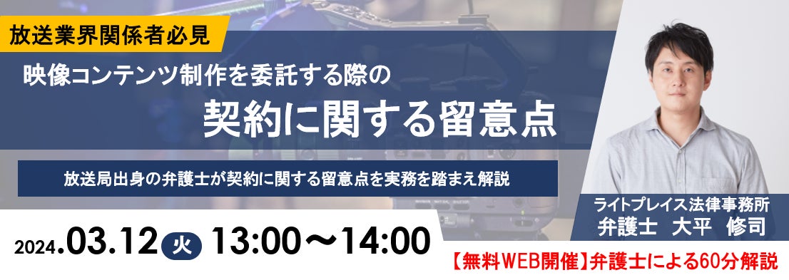 タイトル:『【放送業界関係者必見】【無料WEB開催】映像コンテンツ制作を委託する際の契約に関する留意点」セミナー』