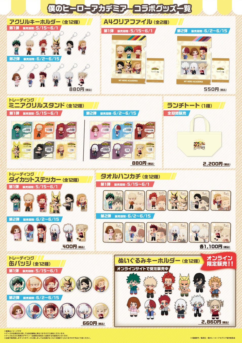 さらに、ジャックインザドーナツ店頭では、コラボキービジュアルに使用されている新規デフォルメイラストを使用したコラボ記念グッズの販売を行います。ヒロアカファンなら見逃せないアイテムです! グッズはコラボ実施店の店頭及び、お近くに実施店舗がない方のために、オンラインでも販売します。