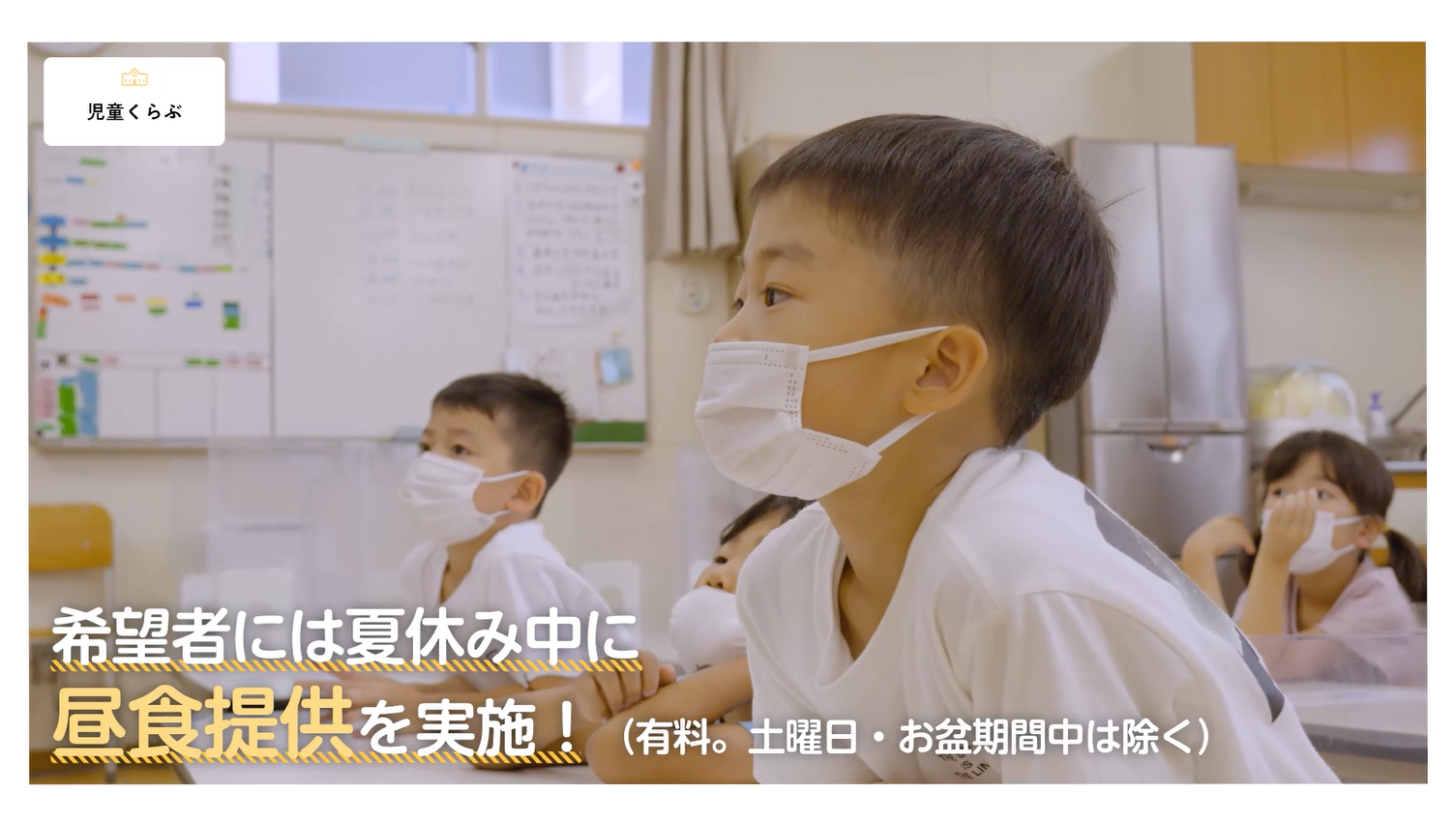 3. すべての小学校に児童を保育する「児童くらぶ」があり、全学年対象に保育時間は午後5時~午後7時までの延長も可能。2023年度から夏休み期間中には希望者に昼食提供を行い(有料。土曜日、お盆期間除く)働く保護者をサポート!