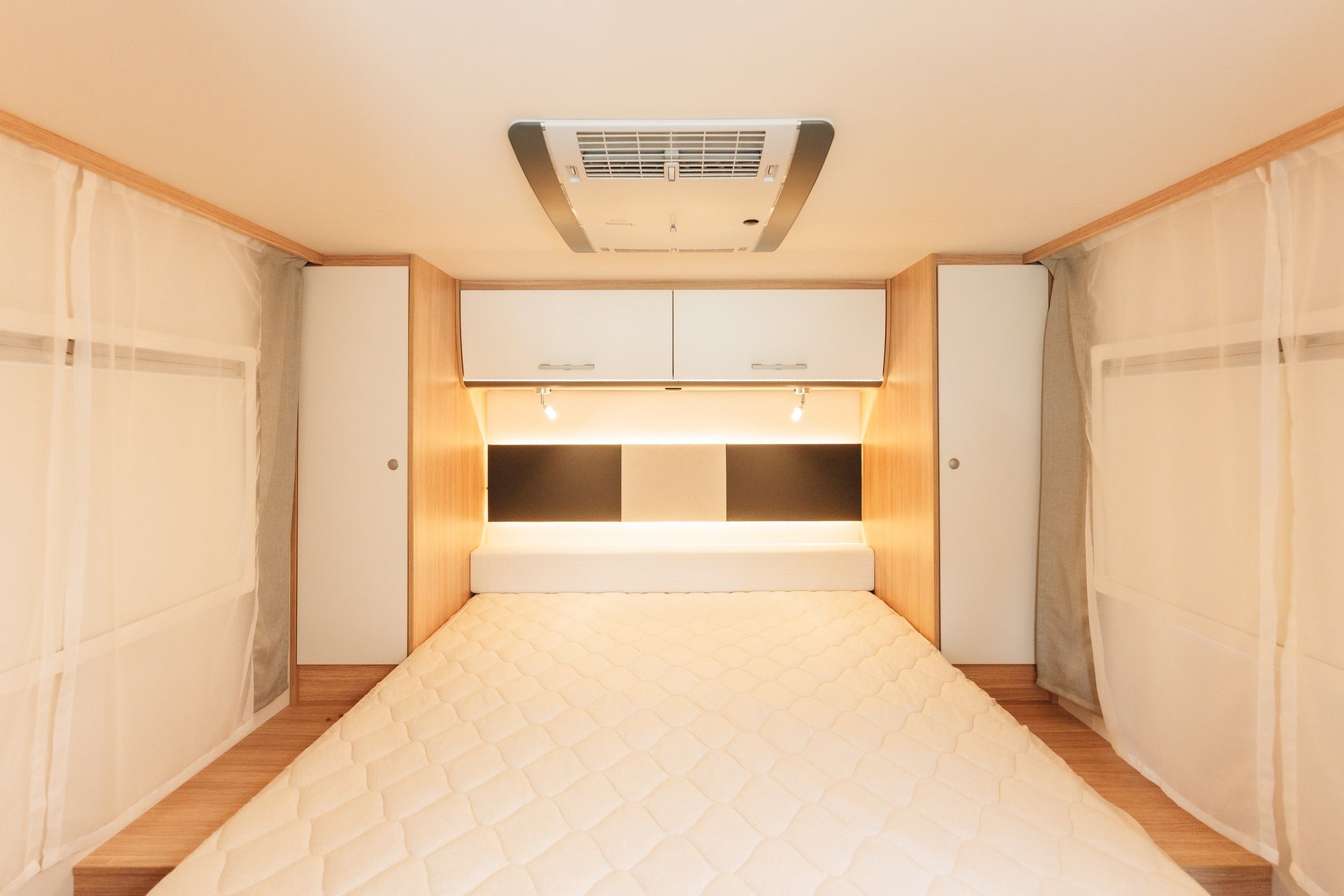 ドイツの老舗のキャンピングカーの作り手が製作したSunlightシリーズの数少ない特別車両。高級ホテルにいるかのようなアイランドベッド仕様になっているのが特徴の車種で、運転席助手席上部にプルダウンベッドが設置されているため、グループ利用にも最適。撮影のロケ待合室の利用にも使用できるなど、様々な用途でご利用できます。