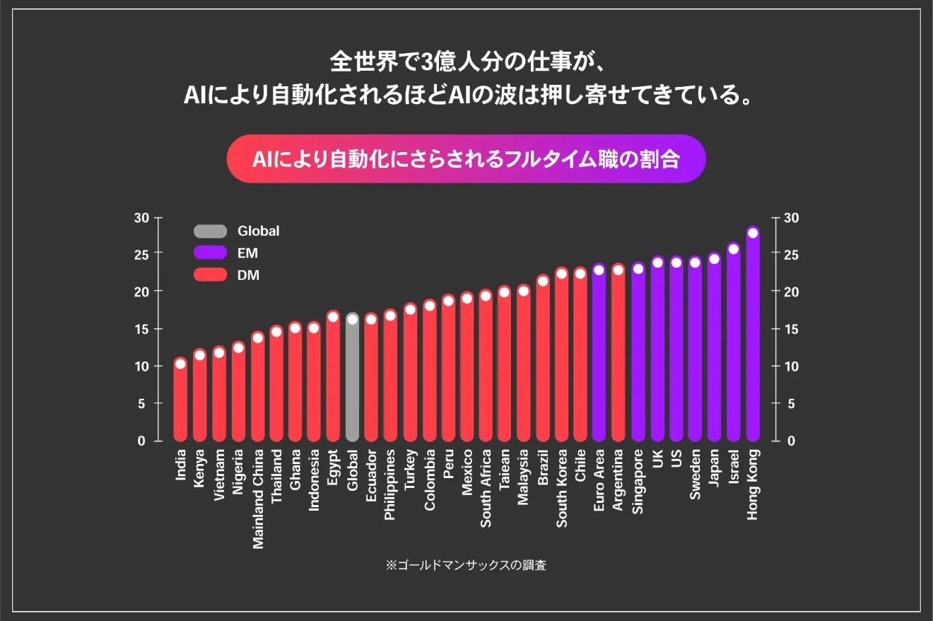 2022年の年末から急速にAIが技術が進歩し、ゴールドマンサックスのレポートによると全世界で3億人のフルタイムの仕事が自動化されると言われています。また、AIが普及することで、今後10年間で世界GDPが7%(700兆円)増加するとも言われています。(日本の2021年GDP成長率は1.7%)*注1