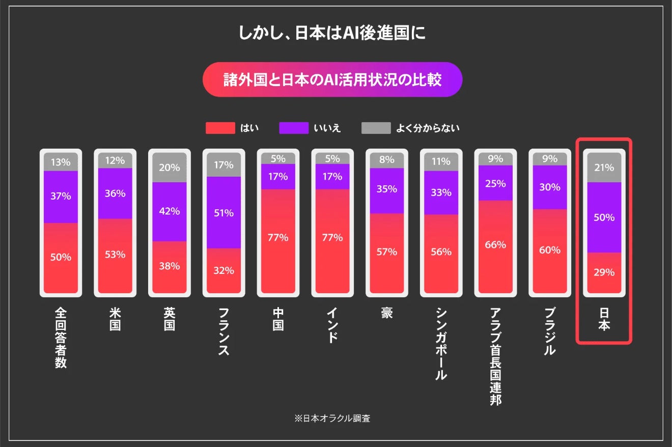 しかし、日本オラクルのデータによると、日本でAI活用を行なっている企業は29%と主要11カ国中最下位です。(2020年11月時点)*注2