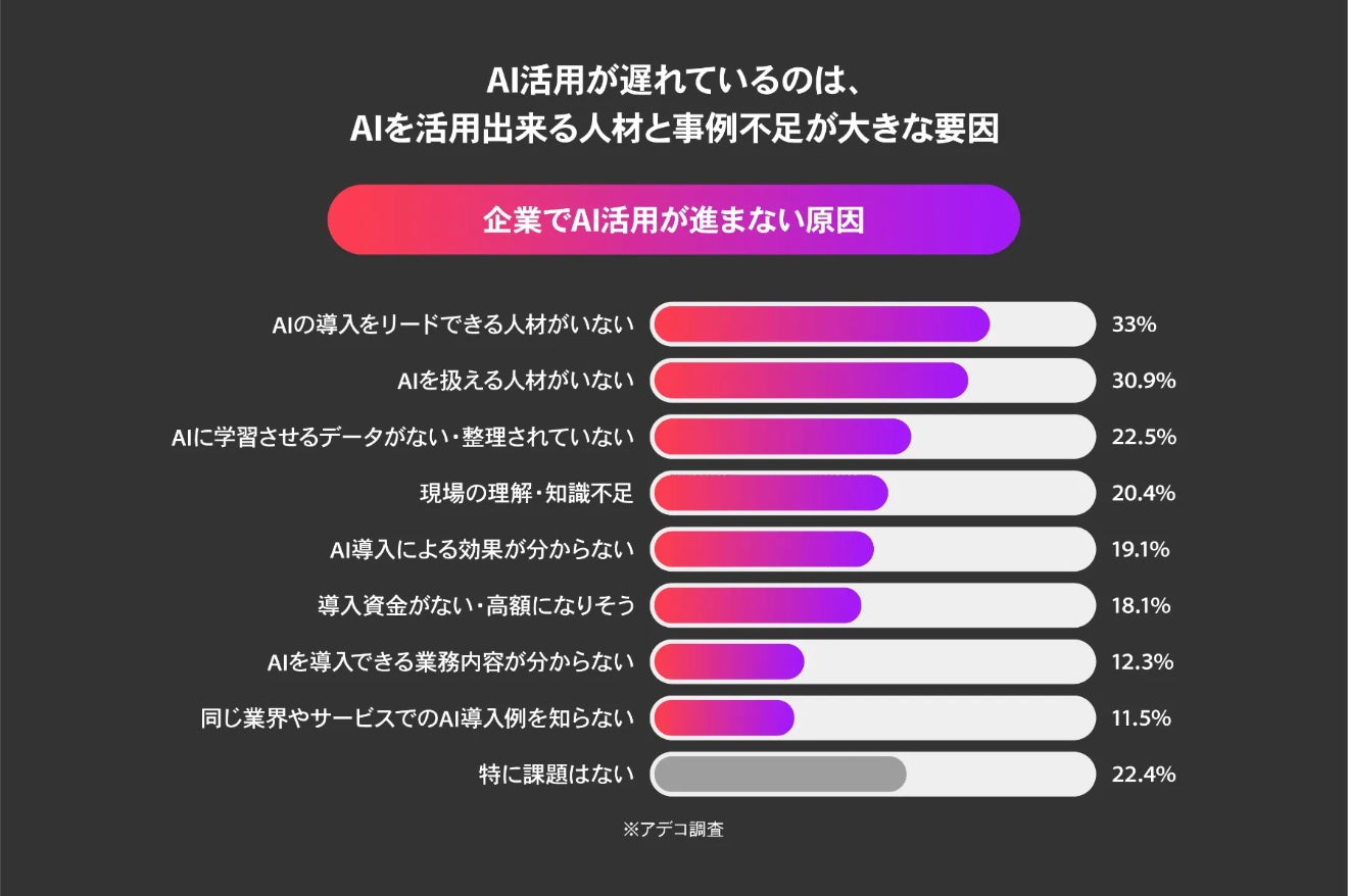 日本でAI活用が進まない主要な原因はAI人材不足とAIの活用イメージがつかない、つまりケーススタディが少ないことです。*注3
