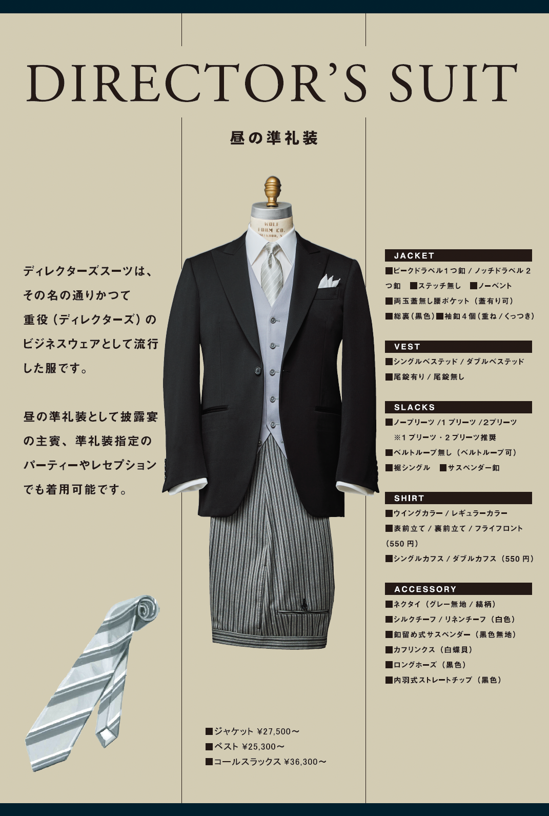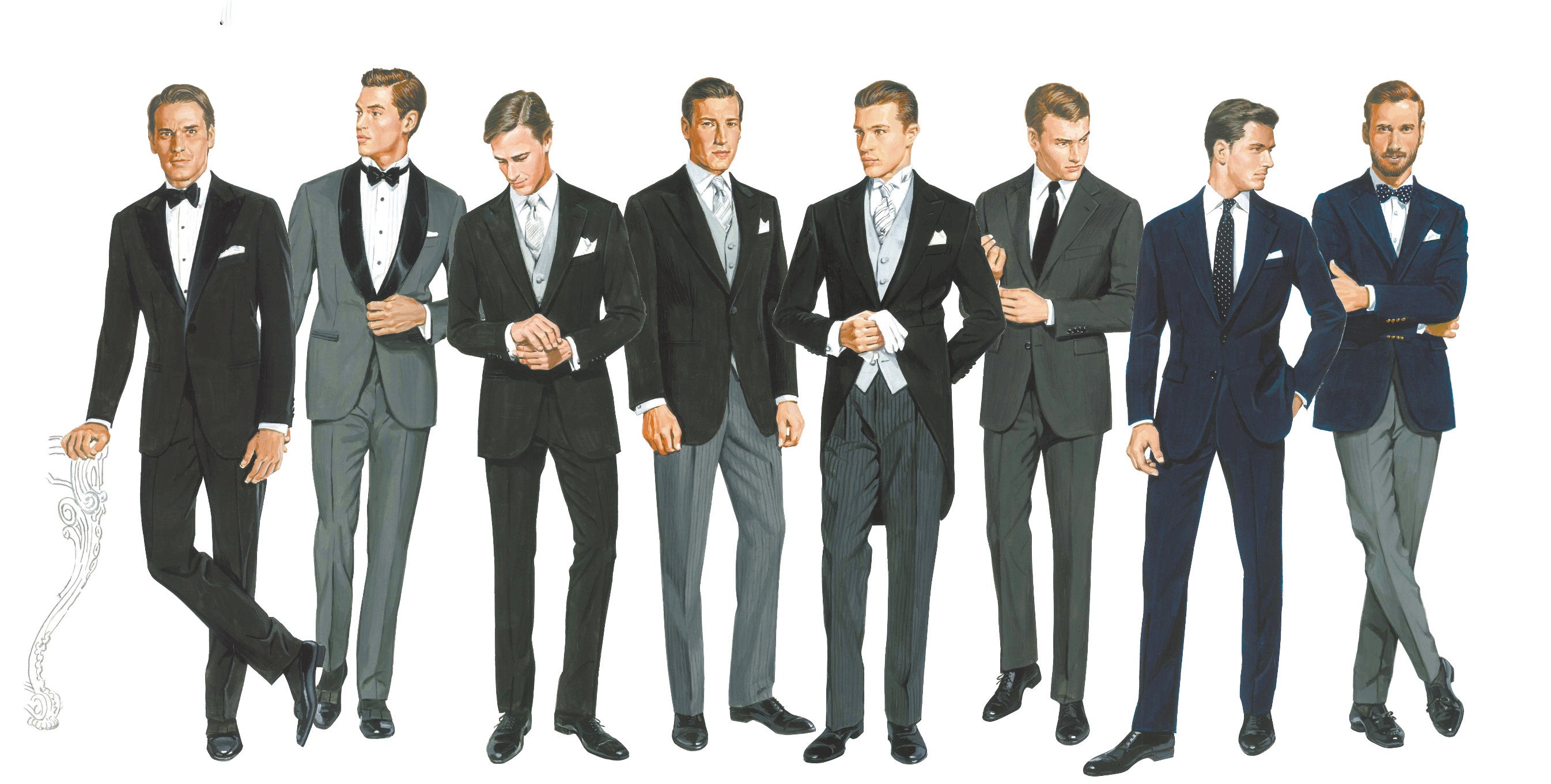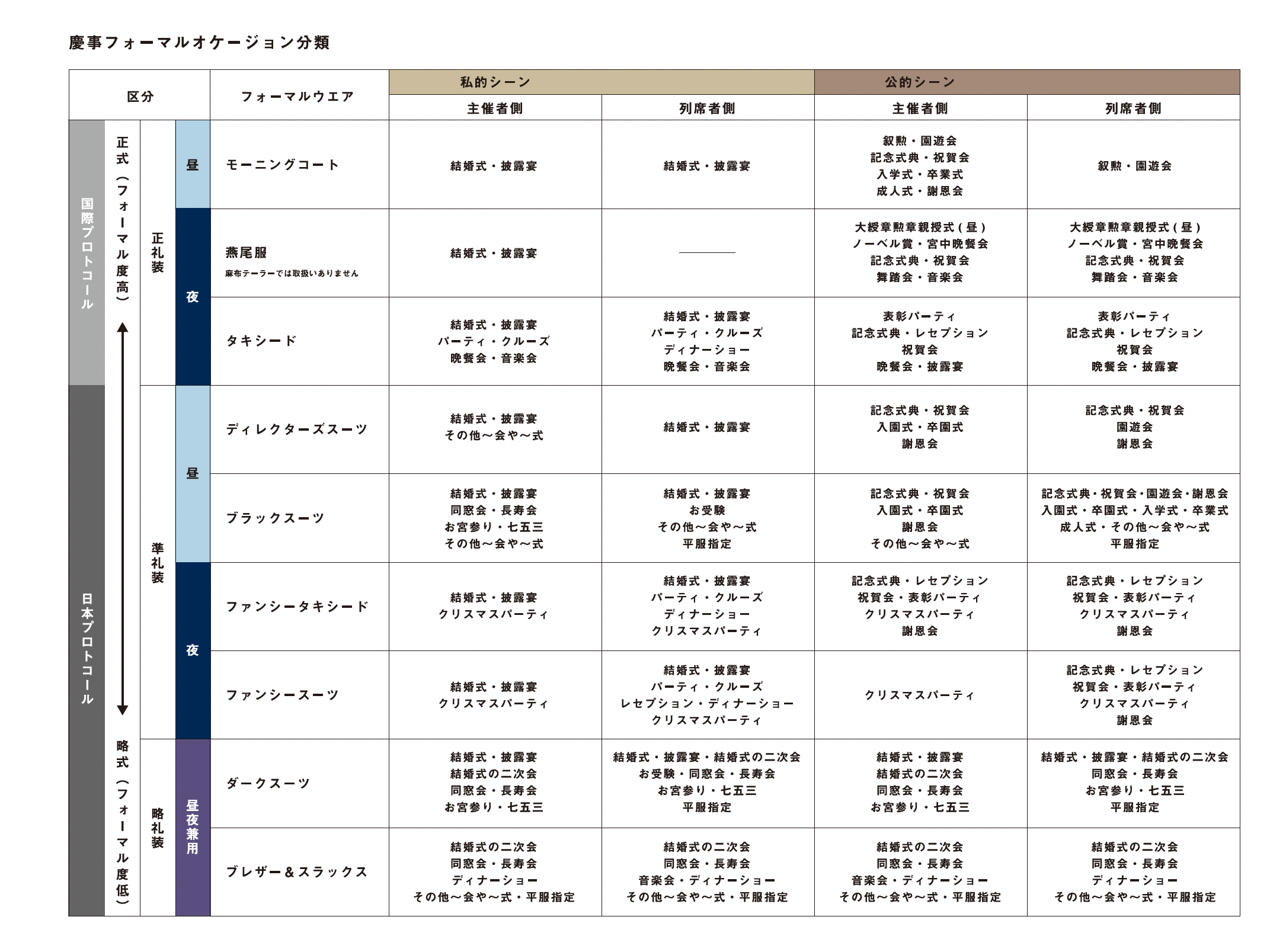 (モーニングコート、ディレクターズスーツ、タキシード、ファンシータキシード、ブレザー、ブラックスーツ、ダークスーツ)