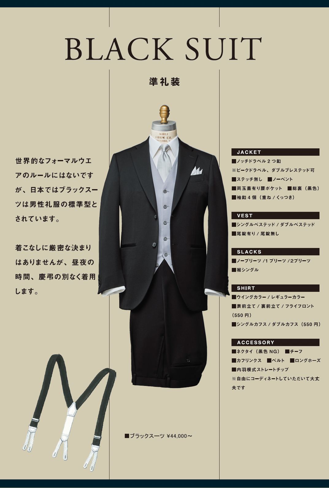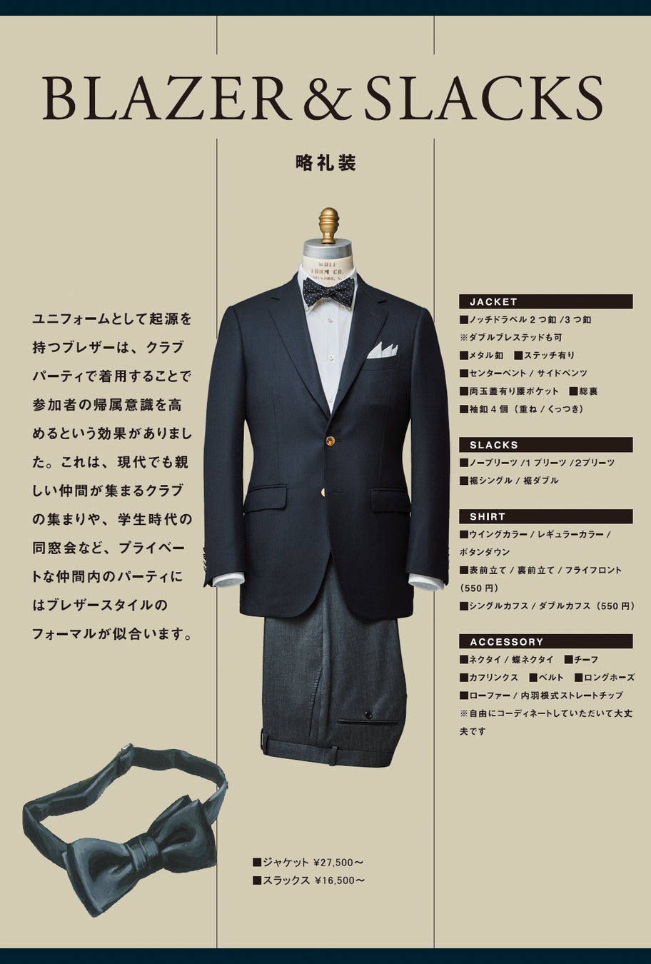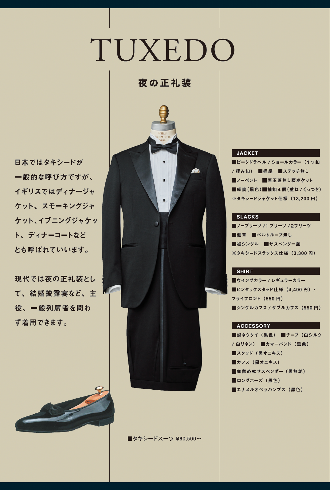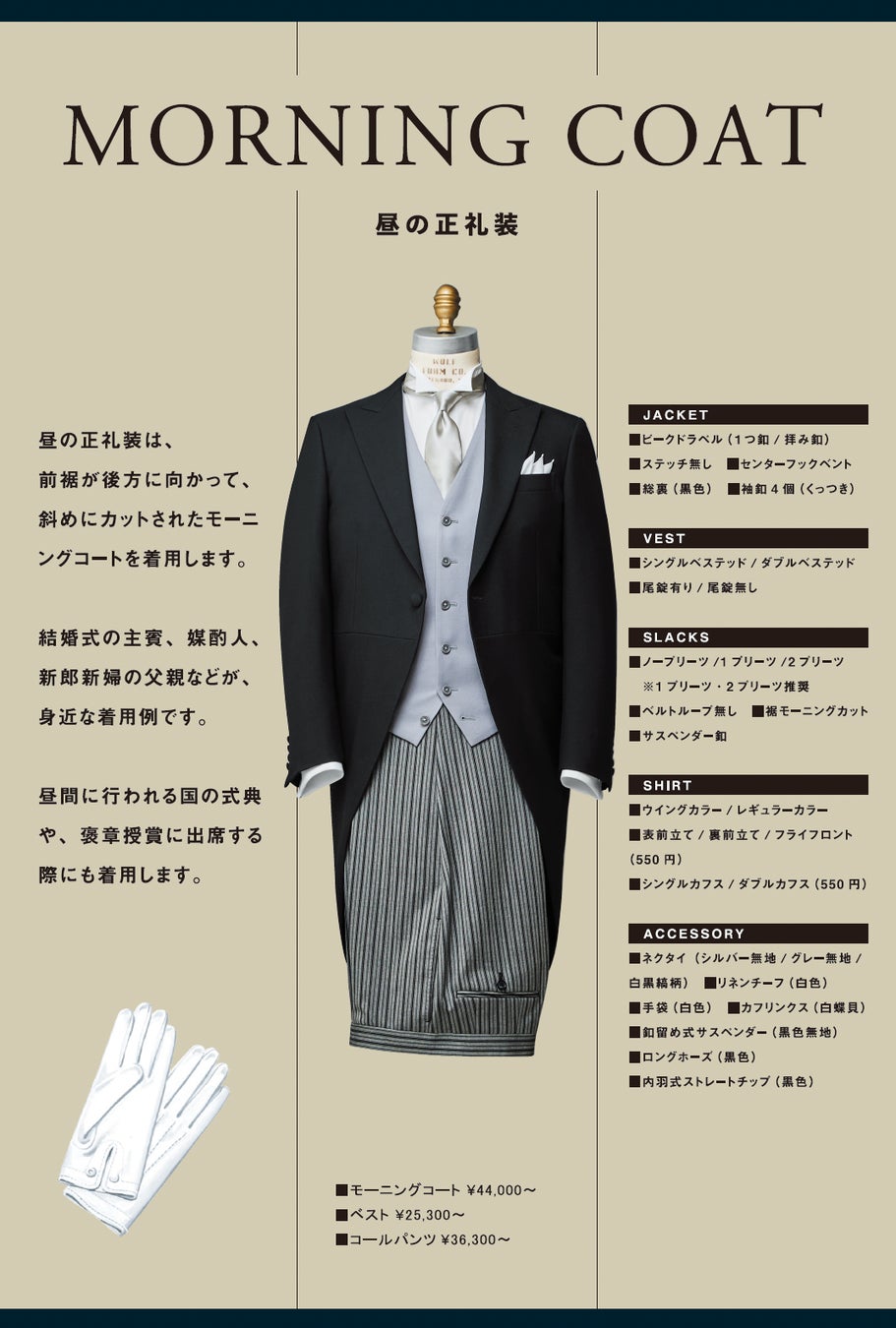 (モーニングコート、ディレクターズスーツ、タキシード、ファンシータキシード、ブレザー、ブラックスーツ、ダークスーツ)