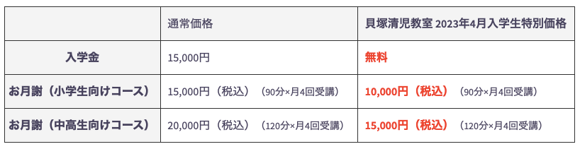 ②:レッスン料通常15,000円(税金込)(90分×月4回)のところ、10,000円(税金込)(90分×月4回)(小学生コース)
