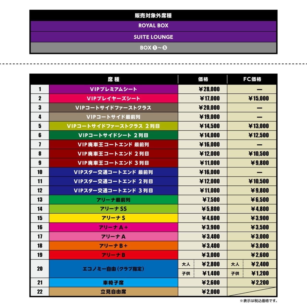 ・スタンドレベルは、指定席や自由席、メインスタンドやコートエンド、1階席や2階席といった、いわゆる一般席としての位置づけとなります。