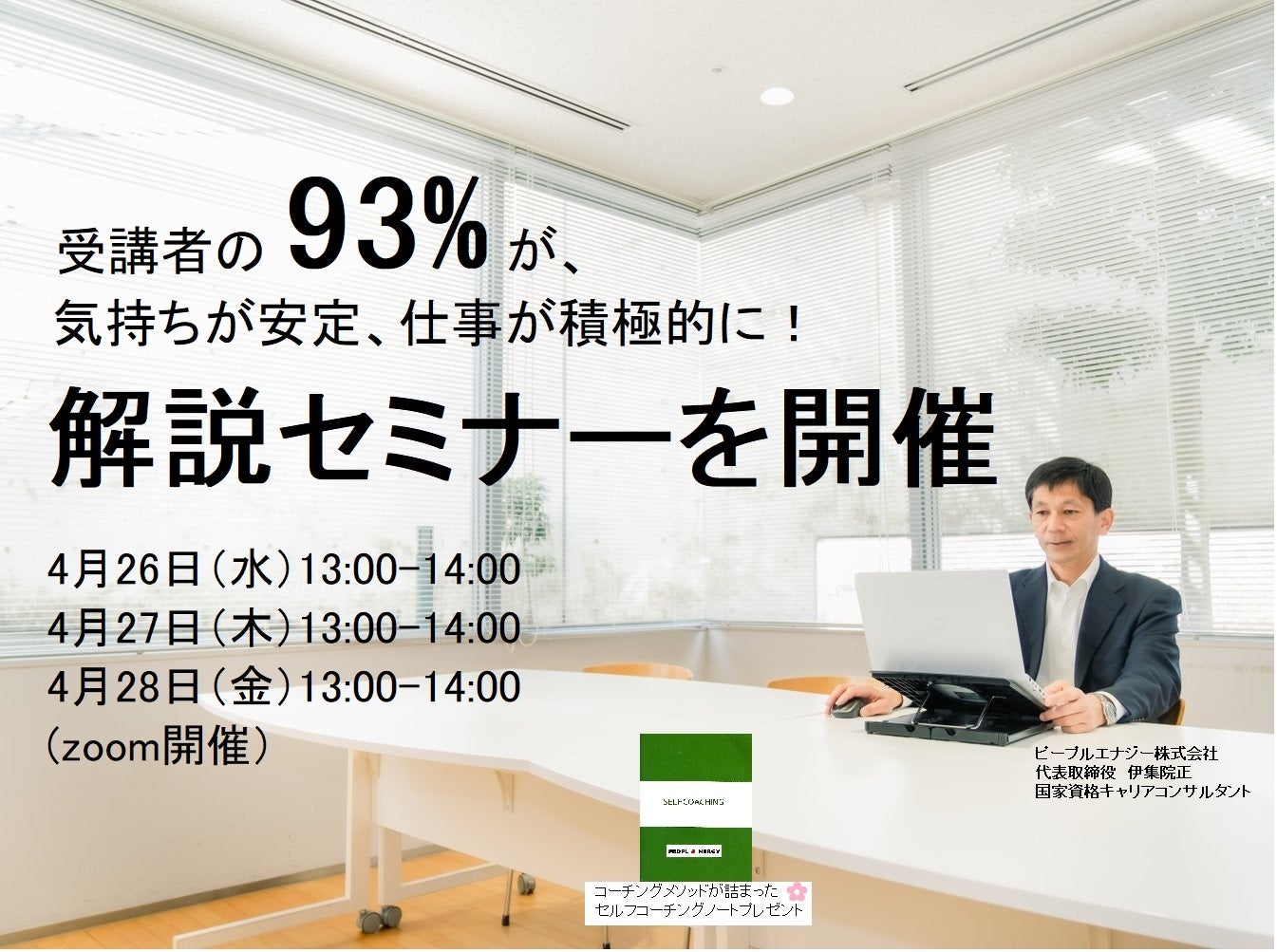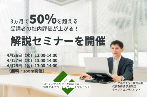 ⼈材コンサルティングのピープルエナジー株式会社(本社:千葉県四街道市、代表取締役:伊集院正)は、2022年、⼤⼿企業3社に、人材育成の一環として『セルフコーチングプログラム』を試験導⼊しました。『セルフコーチングプログラム』として、認知行動療法を活用した3ヵ月間の1on1コーチングの後、数回のフォロー面談を実施しました。結果、受講者の93%が、安定した気持ちで、仕事に積極的に取り組めるようになりました。また、53%の受講者の社内評価が向上しました。4月26日(水)、4月27日(木)、4月28日(金)に開催する『セルフコーチングプログラム』無料解説セミナーにて、代表取締役の伊集院が詳細を説明します。