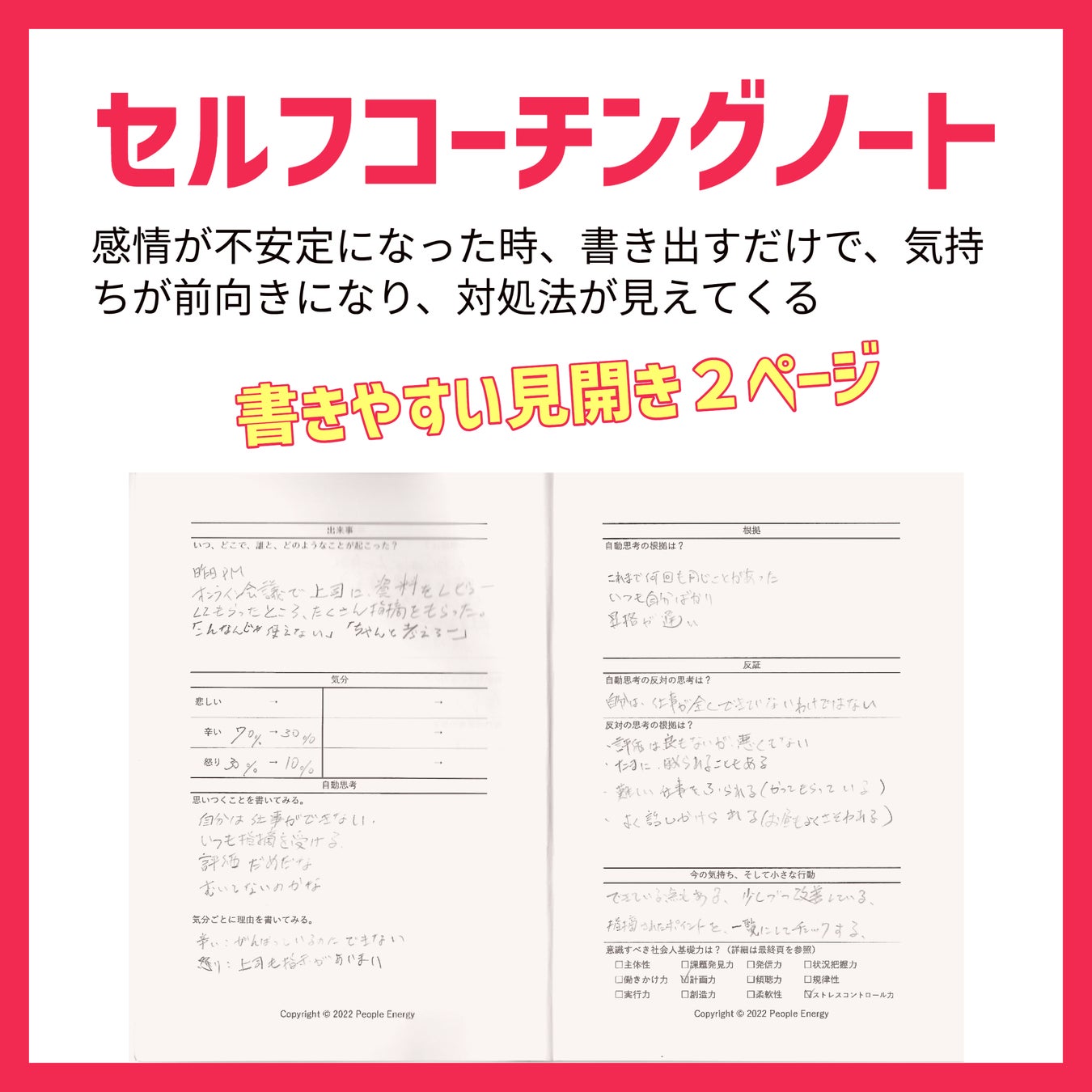 仕事で失敗した時、ネガティブな気持ちになった時、不安な気持ちになった時、セルフコーチングノートに出来事、思考、感情などを書くことで、気持ちが前向きになり、行動し易くなります。社会人基礎力と関連づけることで、仕事のパフォーマンス向上につながるようになっています。