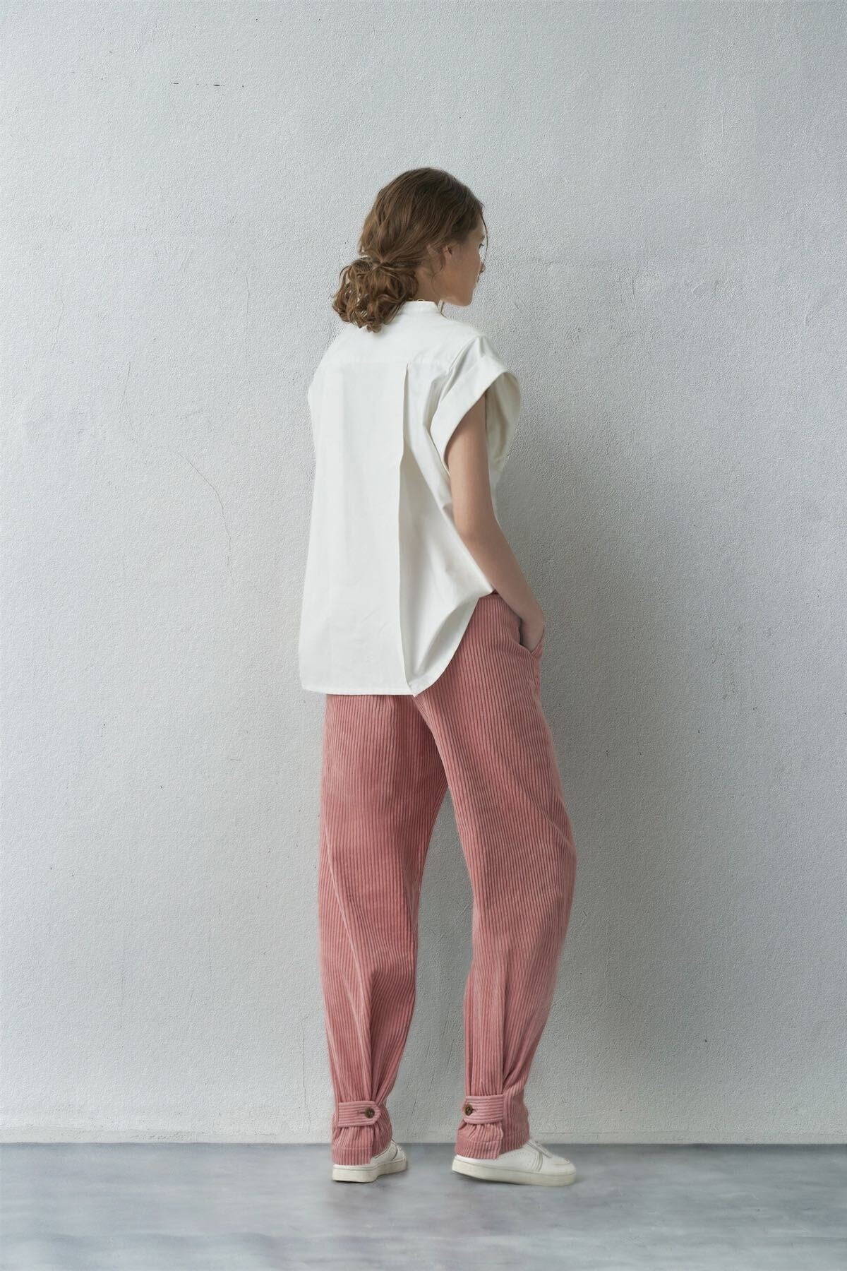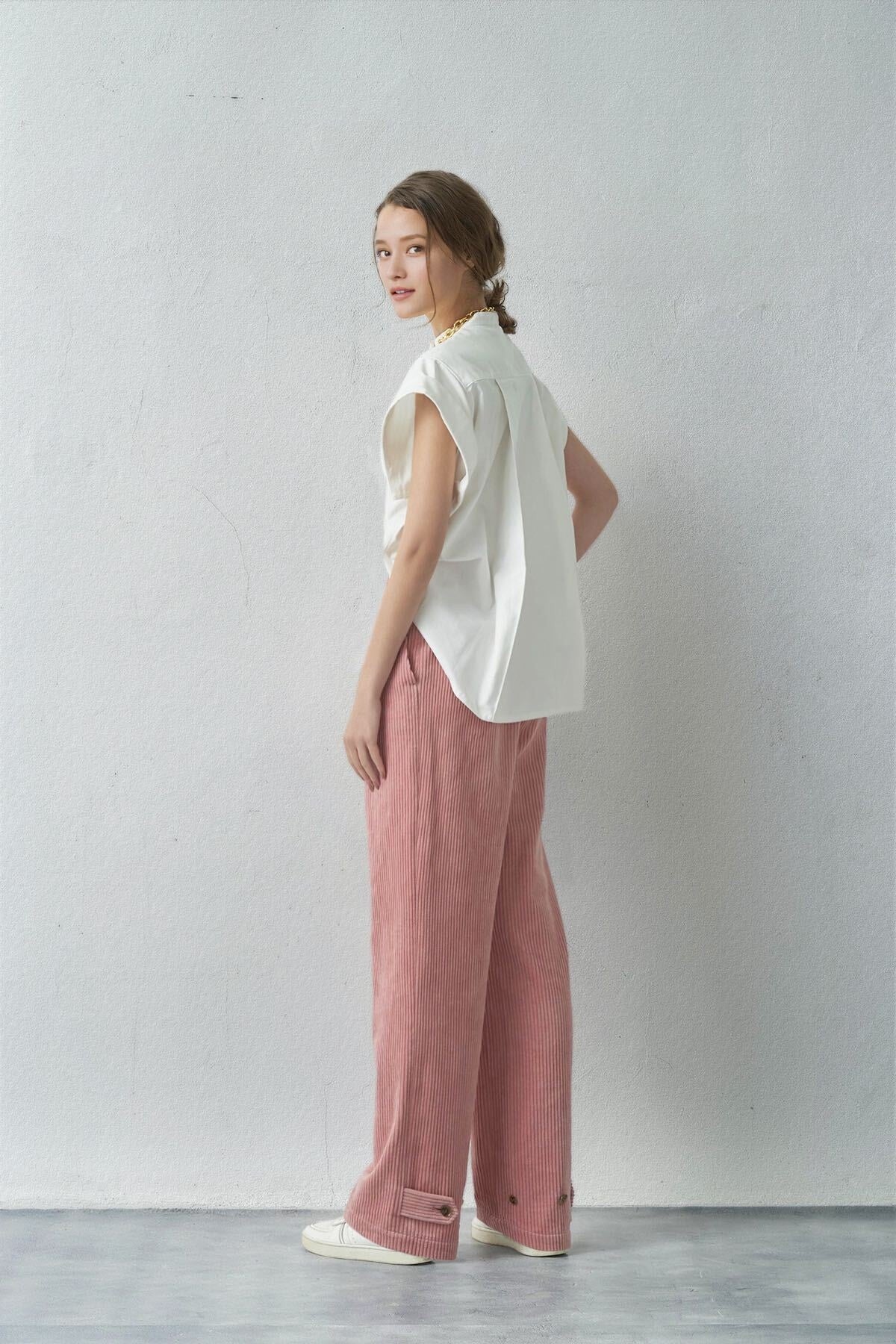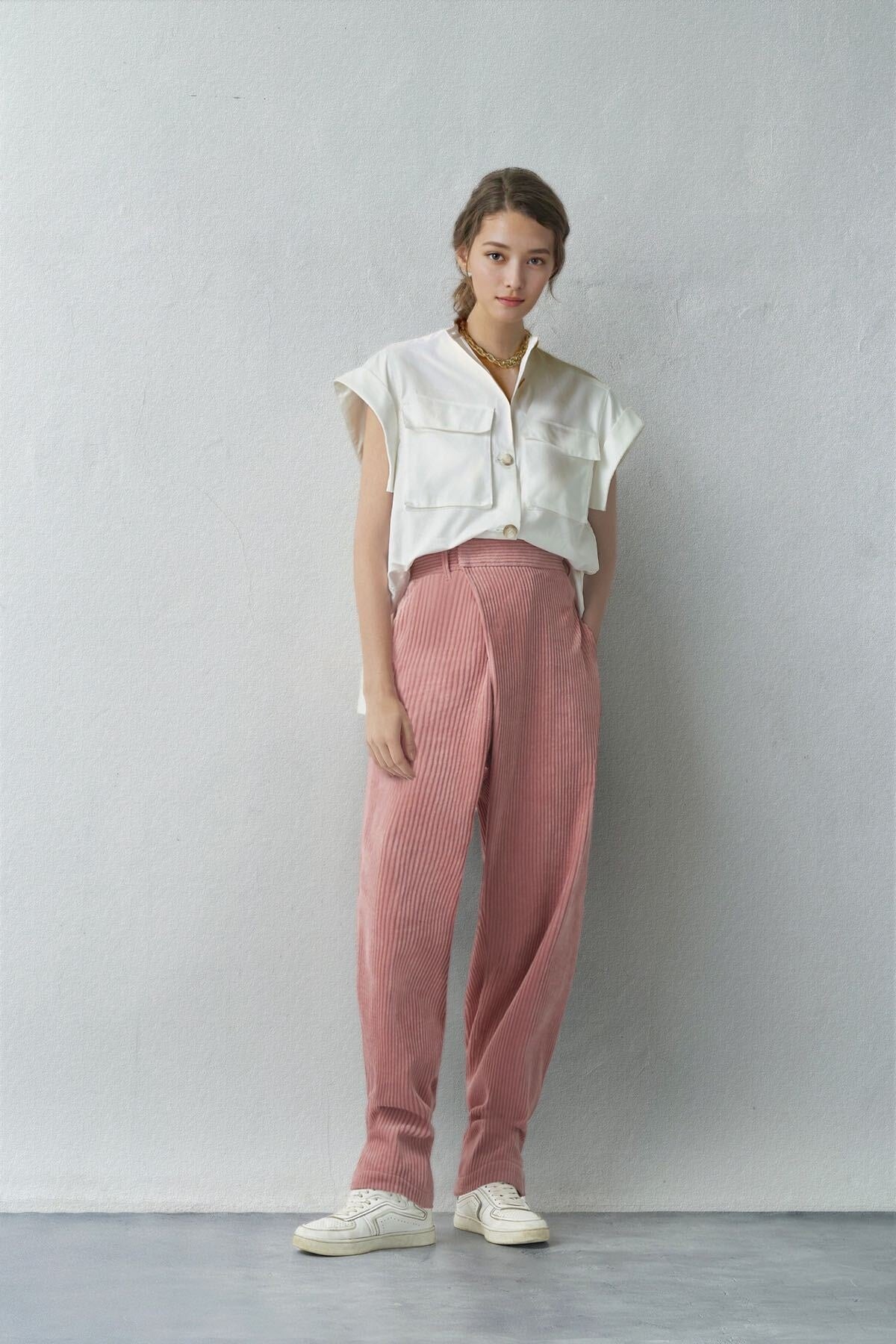 うねのように起伏がある日々でさえ、気分よく(Groovy)楽しもうというコンセプトから生まれたコーデュロイパンツ。コンフォートな生地と身体のフォルムを美しく見せる計算されたラインが、動きやすさと美しさを実現しました。ボタンで裾を絞ればテーパードにも早変わり。もちろん素材の上質感を残しつつ、気兼ねなく着用していただけるように、撥水・撥油加工も施しました。コーディネートをパッと明るく見せるマチュアなピンクが新登場。