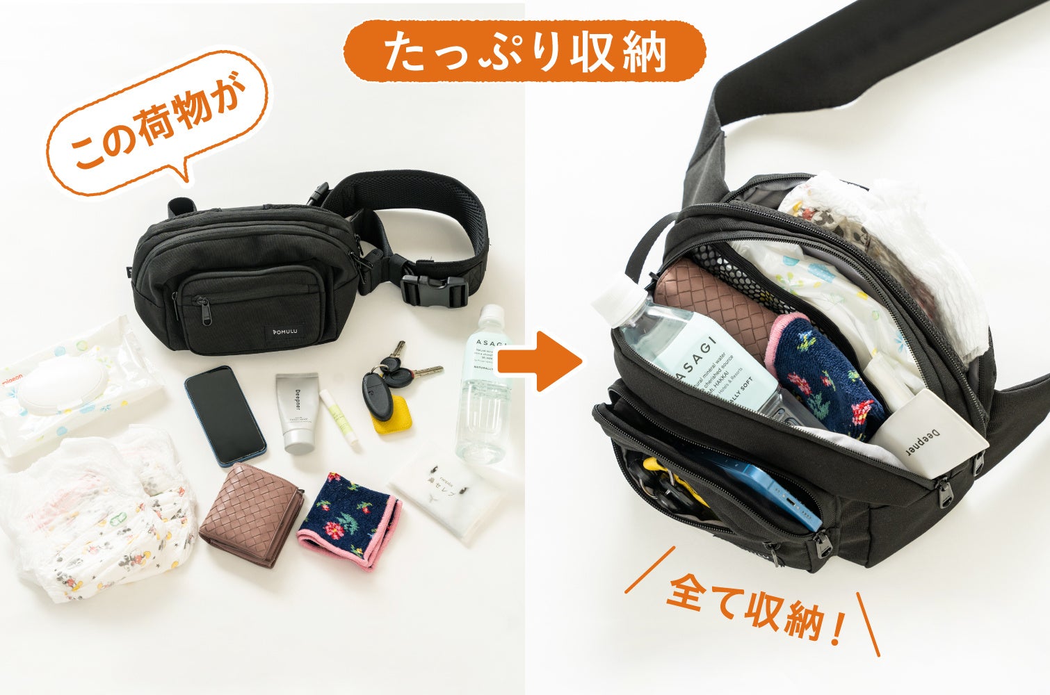 ショルダーバッグが、お子さまを抱っこできるヒップシートへ早変わり!密着力も高く、お子さまとの目線も近い状態で、簡単かつ安定して抱っこをすることができます。また、お出かけの荷物をバッグの中に収納することができる為、これひとつでお子さまとお出かけすることが可能となり、手荷物を減らすことができます。