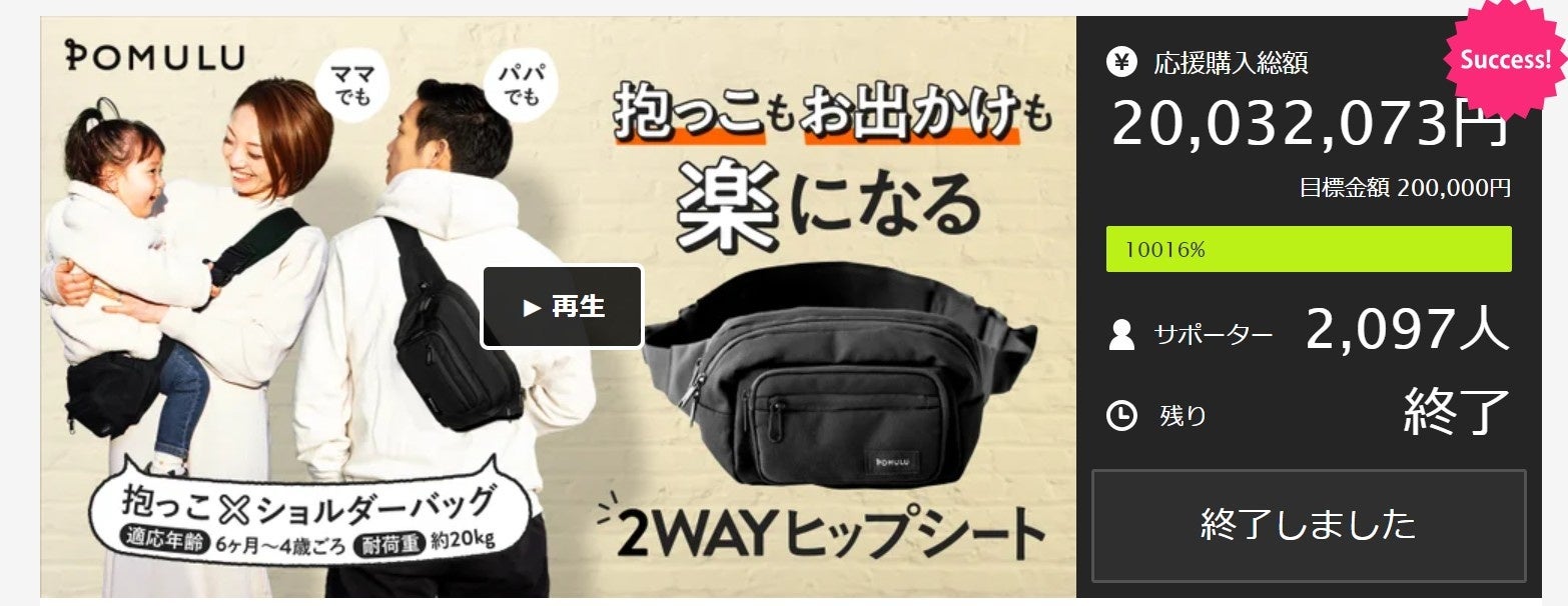 楽天市場でもランキング3冠を達成した2WAYヒップシート「ボーンブーン」のNEWタイプ版として、クラウドファンディングサイト「Makuake」にて事前予約販売を実施(実施期間:2023/3/15~4/29)、開始10分で【超超早割プラン】300セットが完売し、最終的には合計で約2,100名の方々から2,000万円のご支援調達を達成いたしました。