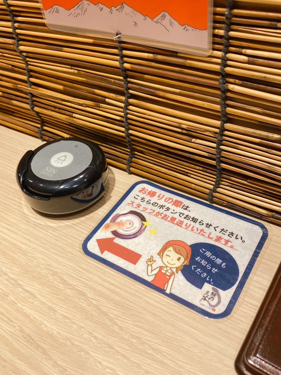 お客様がお帰りの際に、このお帰りボタンを押していただくことで店内にいるスタッフが精いっぱい心を込めてお客様のお見送りをさせていただきます。