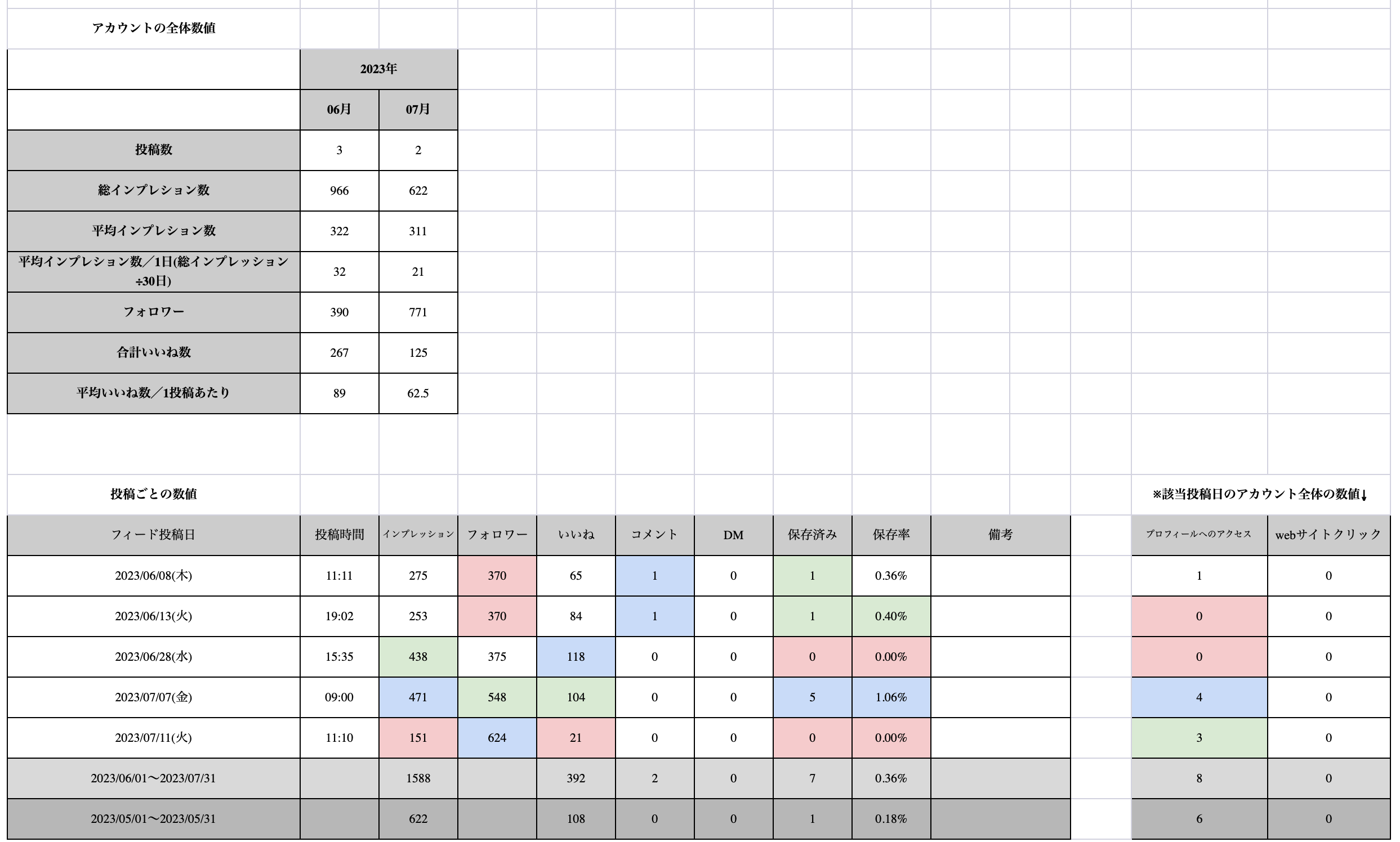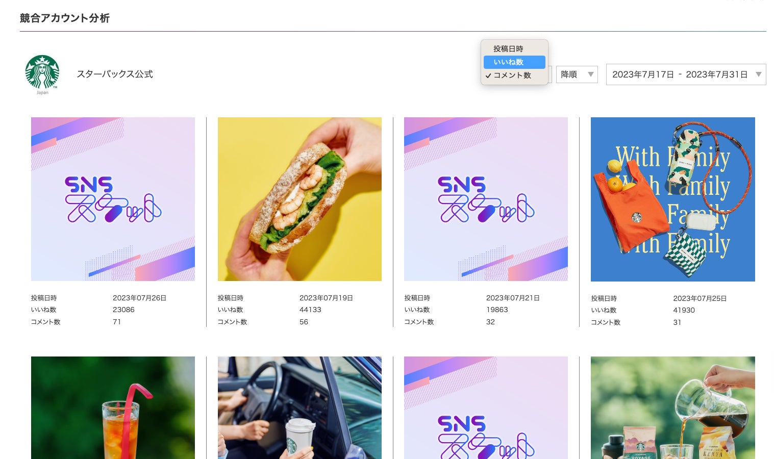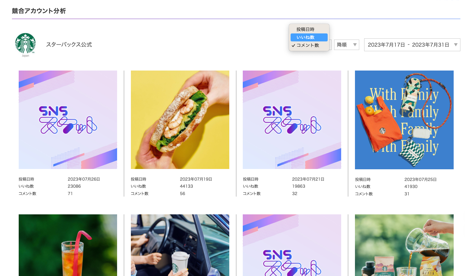 対象期間で絞り込み、いいね数・コメント数で並び替えが可能なので、分析が簡単にできます。