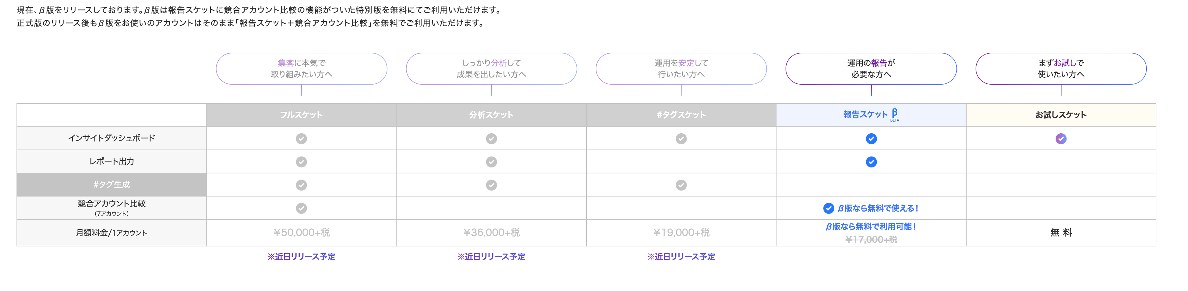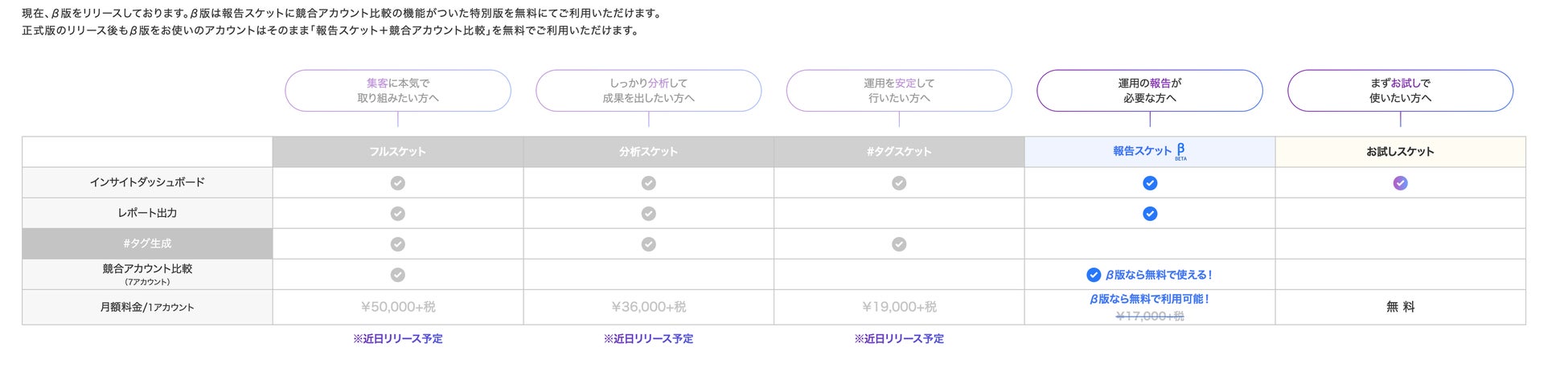 ※正式版のリリース後も、「報告スケット(レポート出力)+競合アカウント比較」の機能はずっと無料になります。