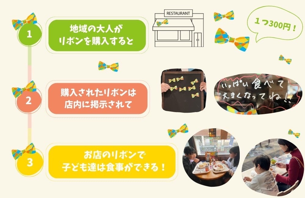 生まれた場所や育った境遇に関わらず「ご飯を食べて、大人に見守られて、元気に外を駆け回る」、そんな光景が全ての子ども達にとって当たり前である社会、そして全ての子ども達が夢に向かって可能性にチャレンジできる社会の実現を目指しています。そのために当団体は、「フードリボン」を導入する飲食店が全国の小学校区およそ19,000ヶ所に最低一ヶ所ずつ展開されることを目標に活動しています。