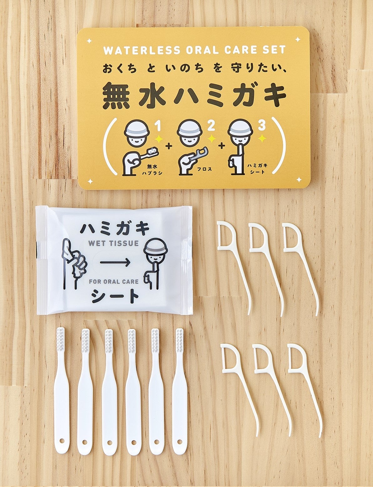 そこで、ヤマトエスロン(株)は「もしもの時、ハミガキで救えるいのちがある」をコンセプトにハブラシ・フロス・ハミガキシートの3ステップで⽔無しでおくちを清潔に保つ、無⽔ハミガキセットを開発しました。